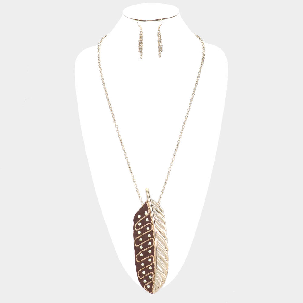 Oversized Leaf Metal Stud Pendant Link Long Necklace