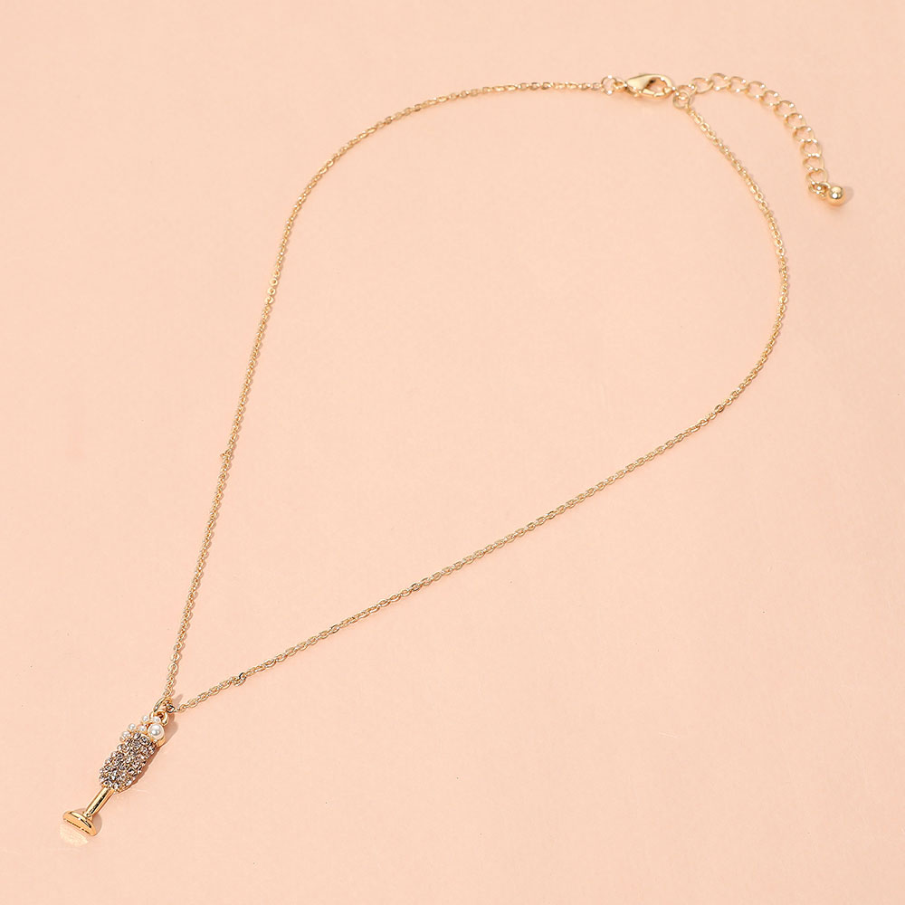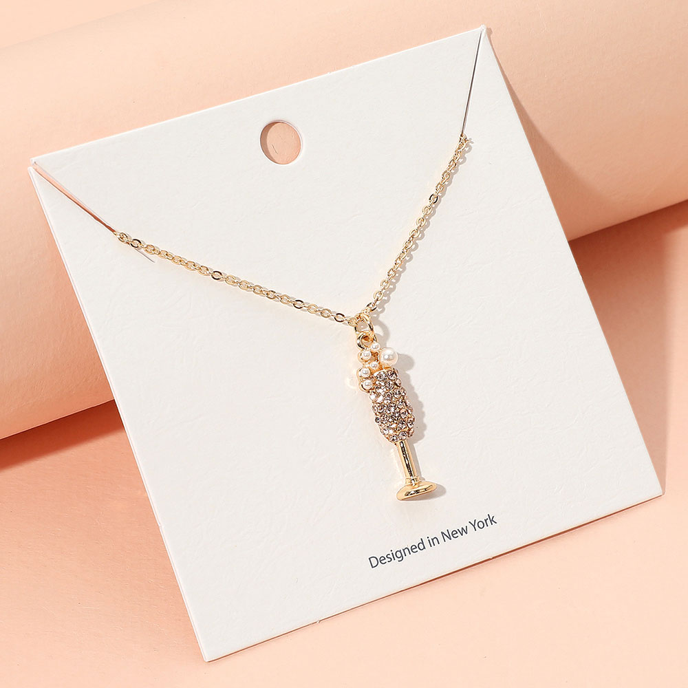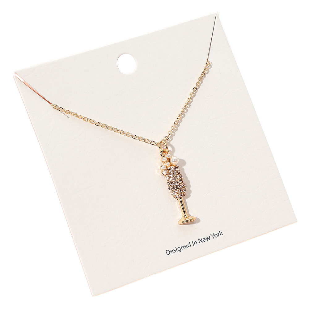 Details • Necklace Size : 16.5" + 2.5" L • Pendant Size : 0.25" X 1.2" • Elegant necklace featuring a sparkling champagne glass pendant with crystal and pearl-like embellishments. Hung on a delicate chain, this festive accessory adds charm and flair to any outfit. Perfect for celebrations, parties, or as a fun gift for someone who loves to toast in style. • Lead and Nickel Compliant