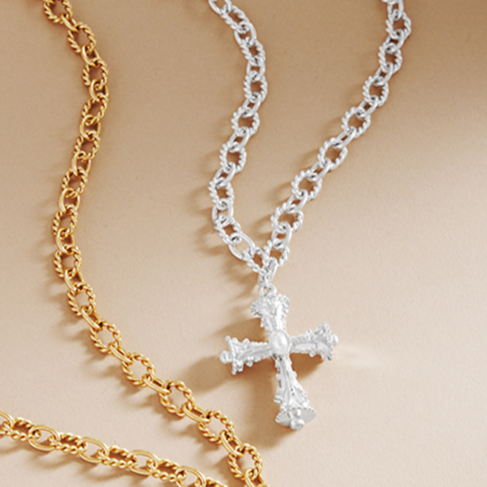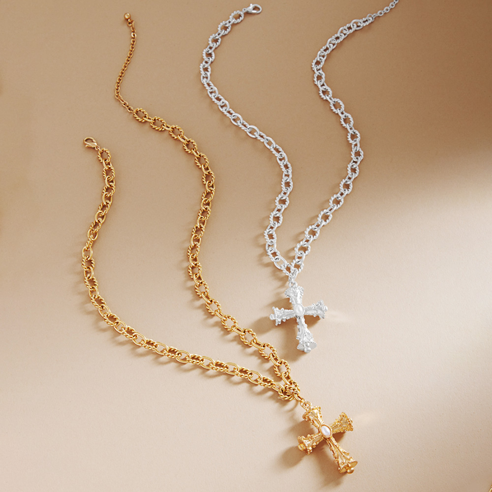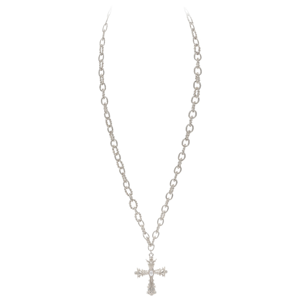 Pearl Pointed Cross Pendant Textured Metal Chain Necklace