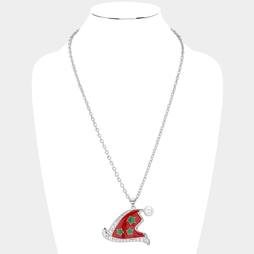 Details • Necklace Size : 26" + 3" L • Pendant Size : 2.25" X 2" • Celebrate the season in style with this festive pendant necklace featuring a Santa hat design adorned with stars and crystal accents. A whimsical holiday accessory perfect for Christmas parties and gifting.