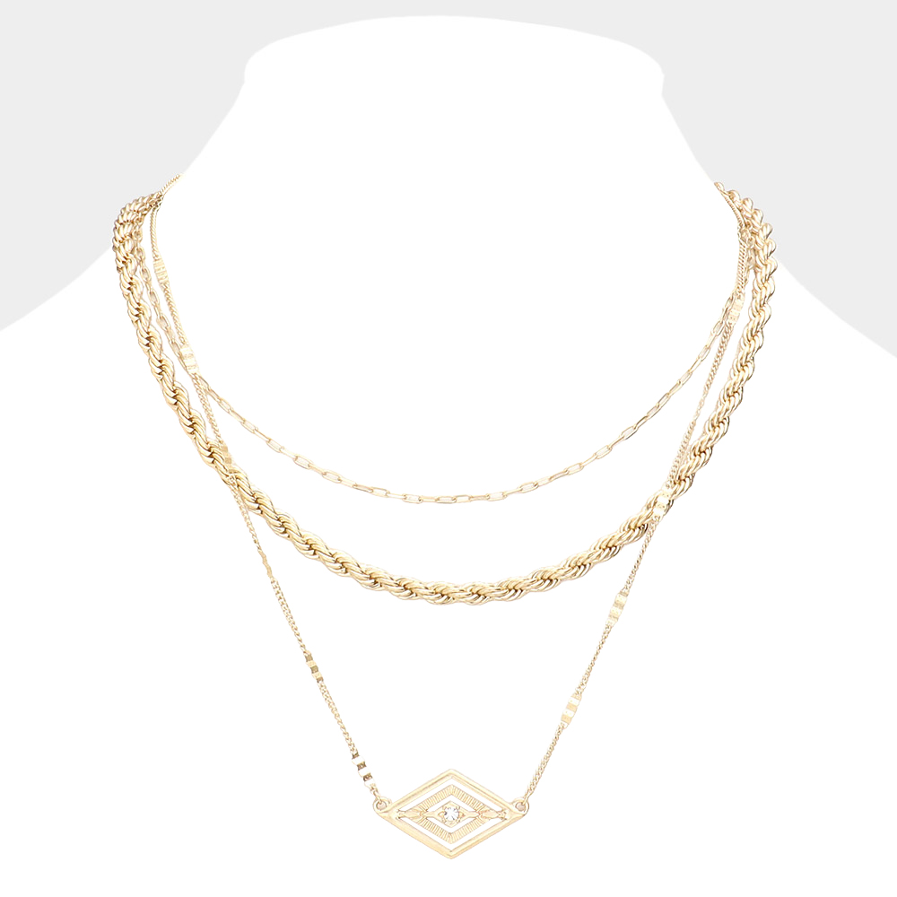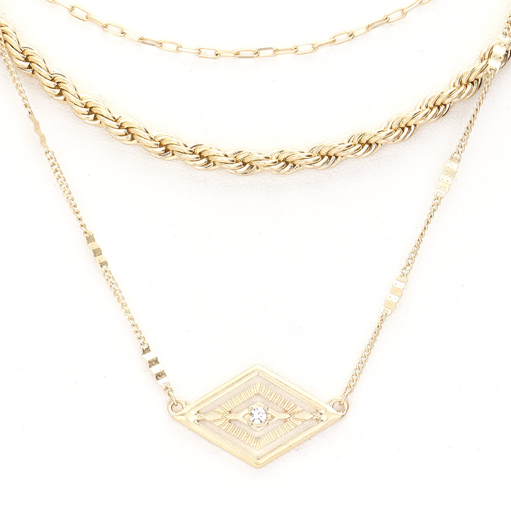 Rhinestone Centered Metal Rhombus Pendant Triple Layered Necklace