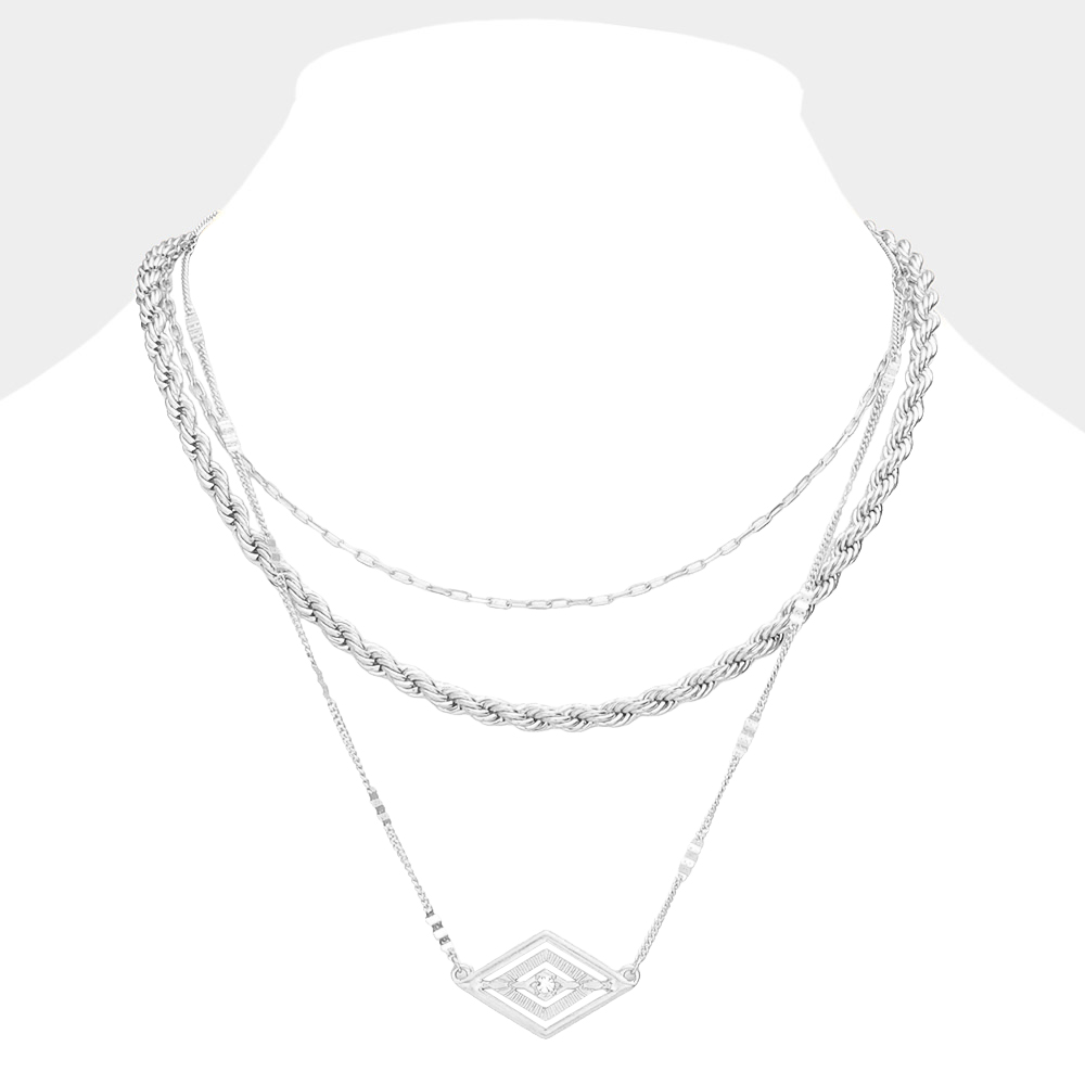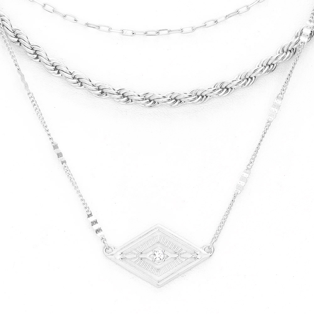 Rhinestone Centered Metal Rhombus Pendant Triple Layered Necklace