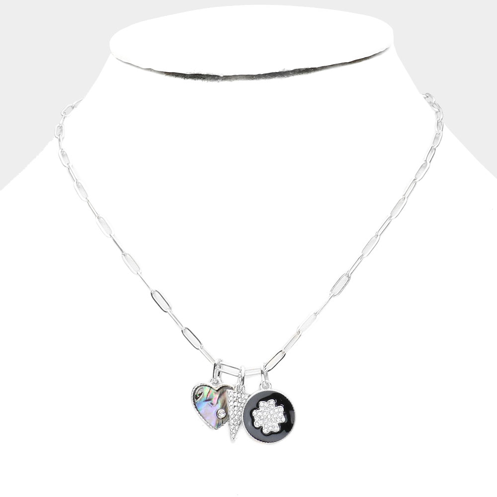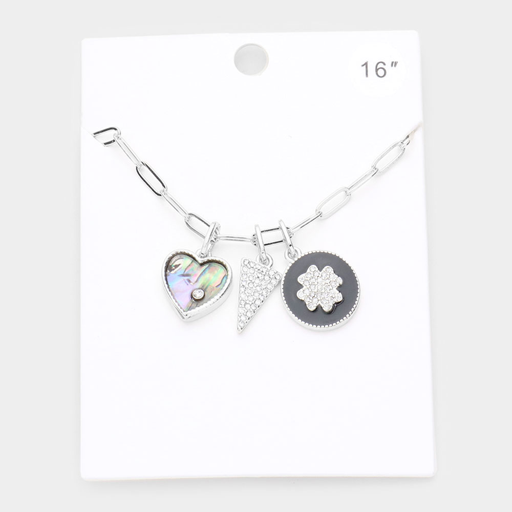 Rhinestone Embellished Abalone Heart Triangle Quatrefoil Pendant Necklace