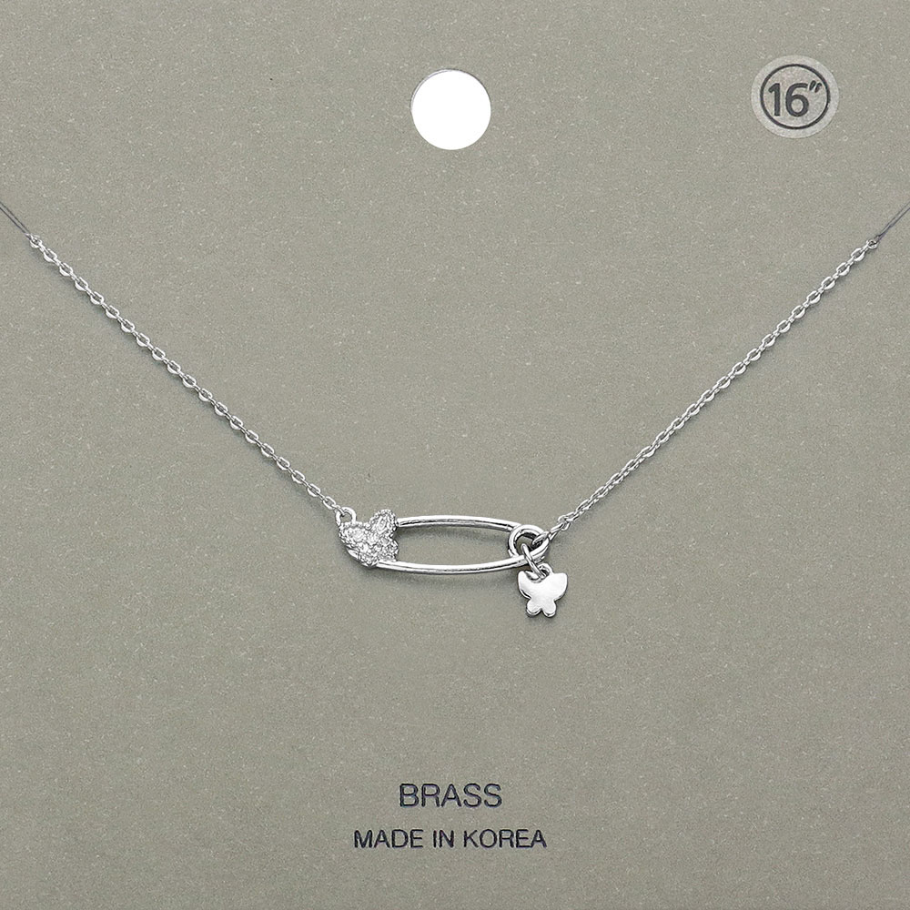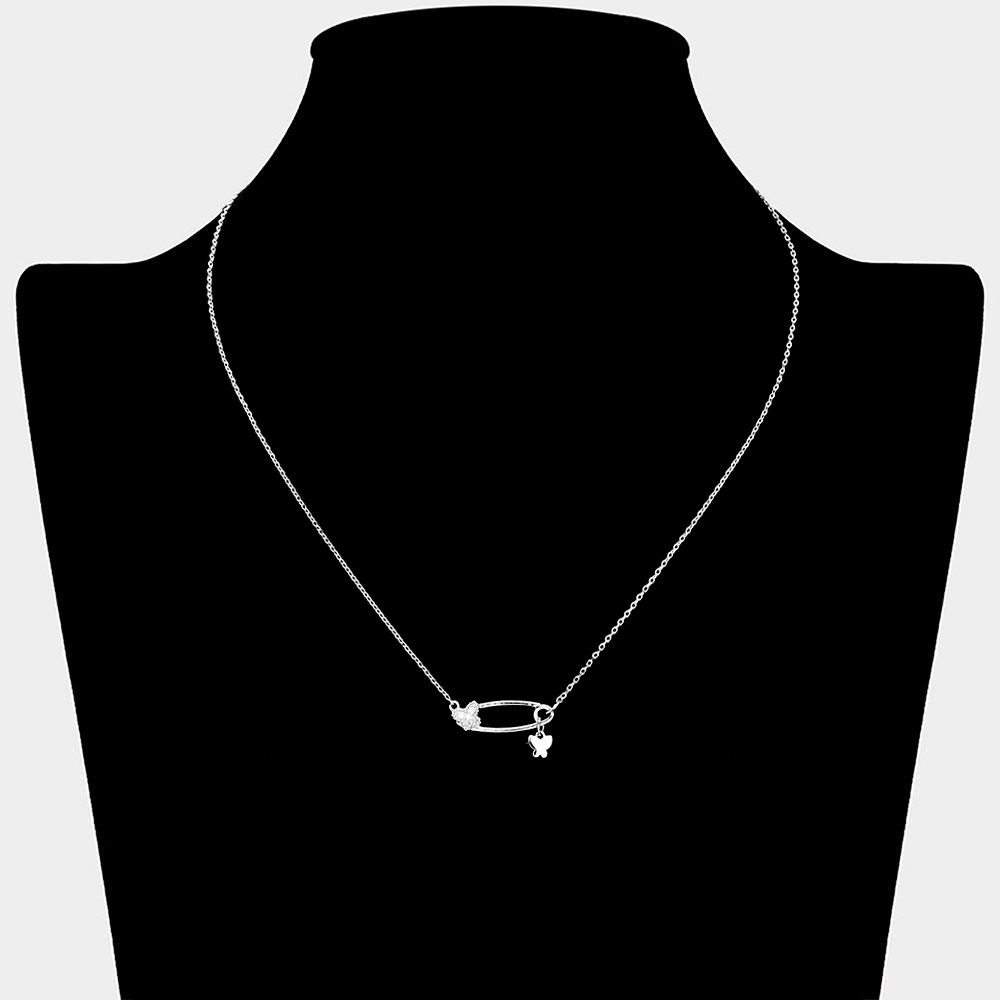 Rhinestone Embellished Brass Metal Butterfly Accented Safety Pin Pendant Necklace