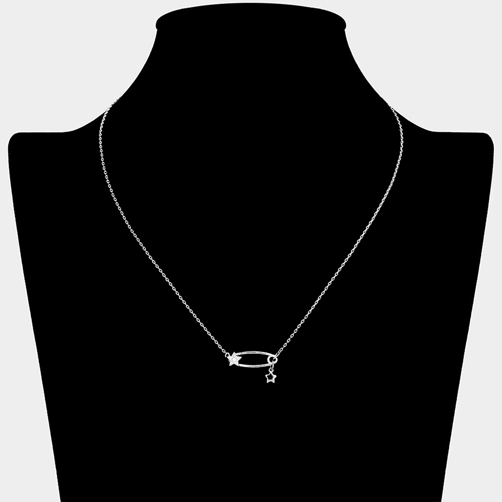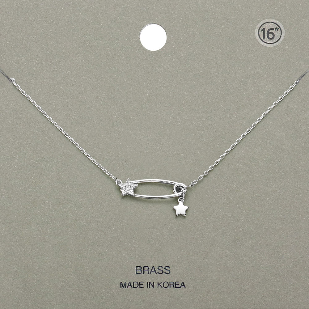 Rhinestone Embellished Brass Metal Star Accented Safety Pin Pendant Necklace