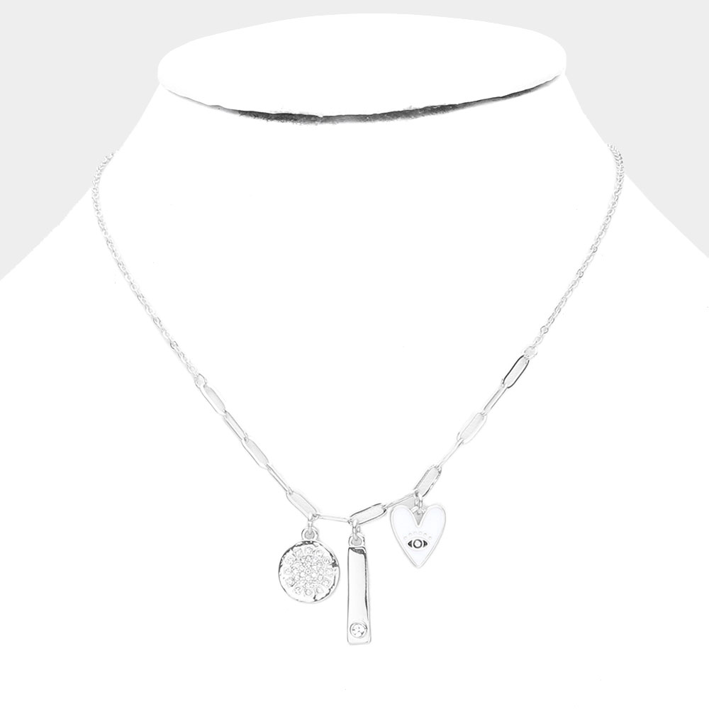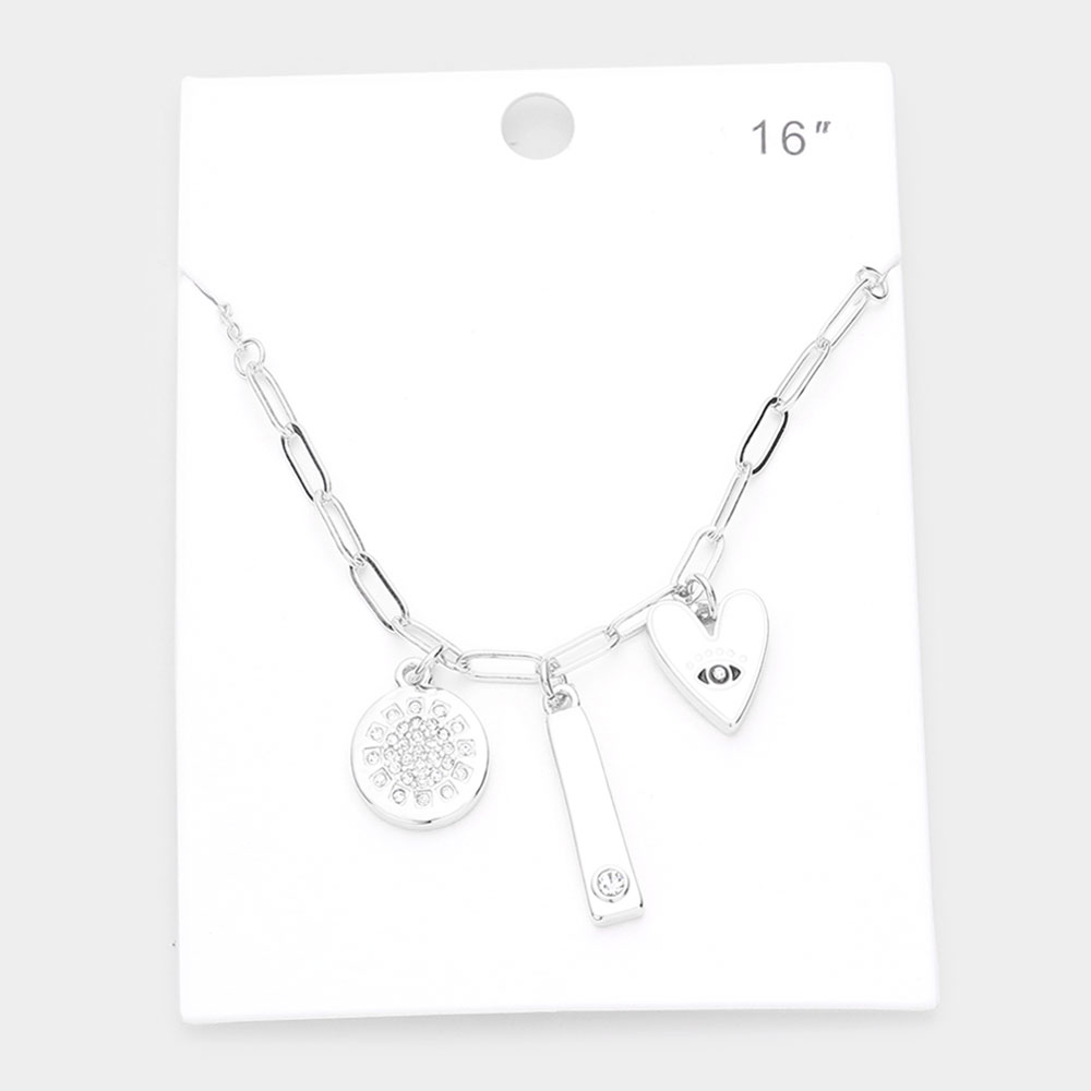 Rhinestone Embellished Metal Round Rectangle Evil Eye Accented Heart Pendant Necklace