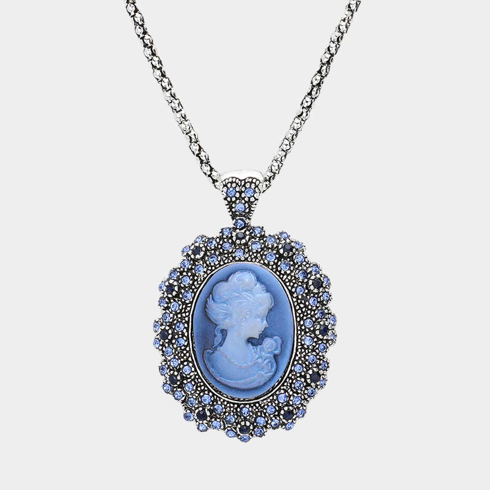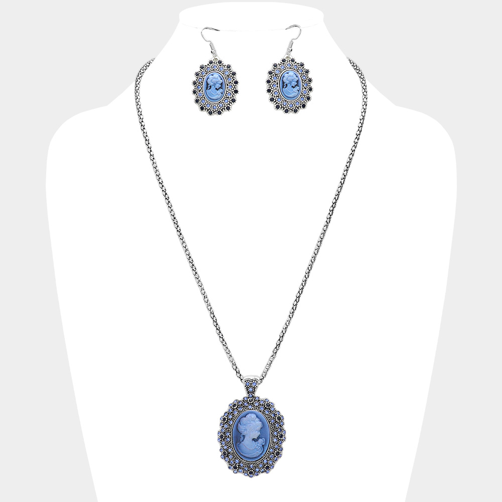 Details • Necklace Size : 25" + 2.75" L • Pendant Size : 1.6" X 2.25" • Earrings Size : 2.1" L • Timeless vintage-inspired jewelry set featuring an ornate cameo pendant necklace and matching drop earrings. Detailed with intricate frames, this elegant set adds a refined, classic touch to both everyday wear and formal occasions. • Lead and Nickel Compliant