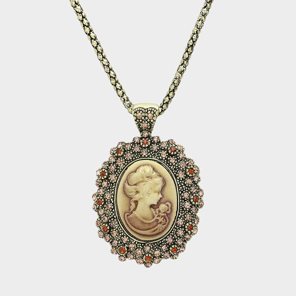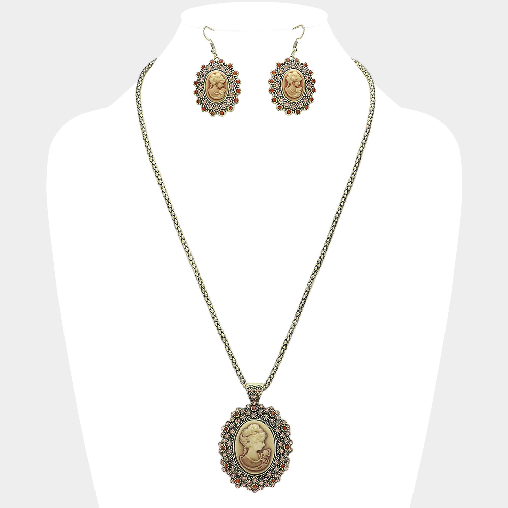 Details • Necklace Size : 25" + 2.75" L • Pendant Size : 1.6" X 2.25" • Earrings Size : 2.1" L • Timeless vintage-inspired jewelry set featuring an ornate cameo pendant necklace and matching drop earrings. Detailed with intricate frames, this elegant set adds a refined, classic touch to both everyday wear and formal occasions. • Lead and Nickel Compliant