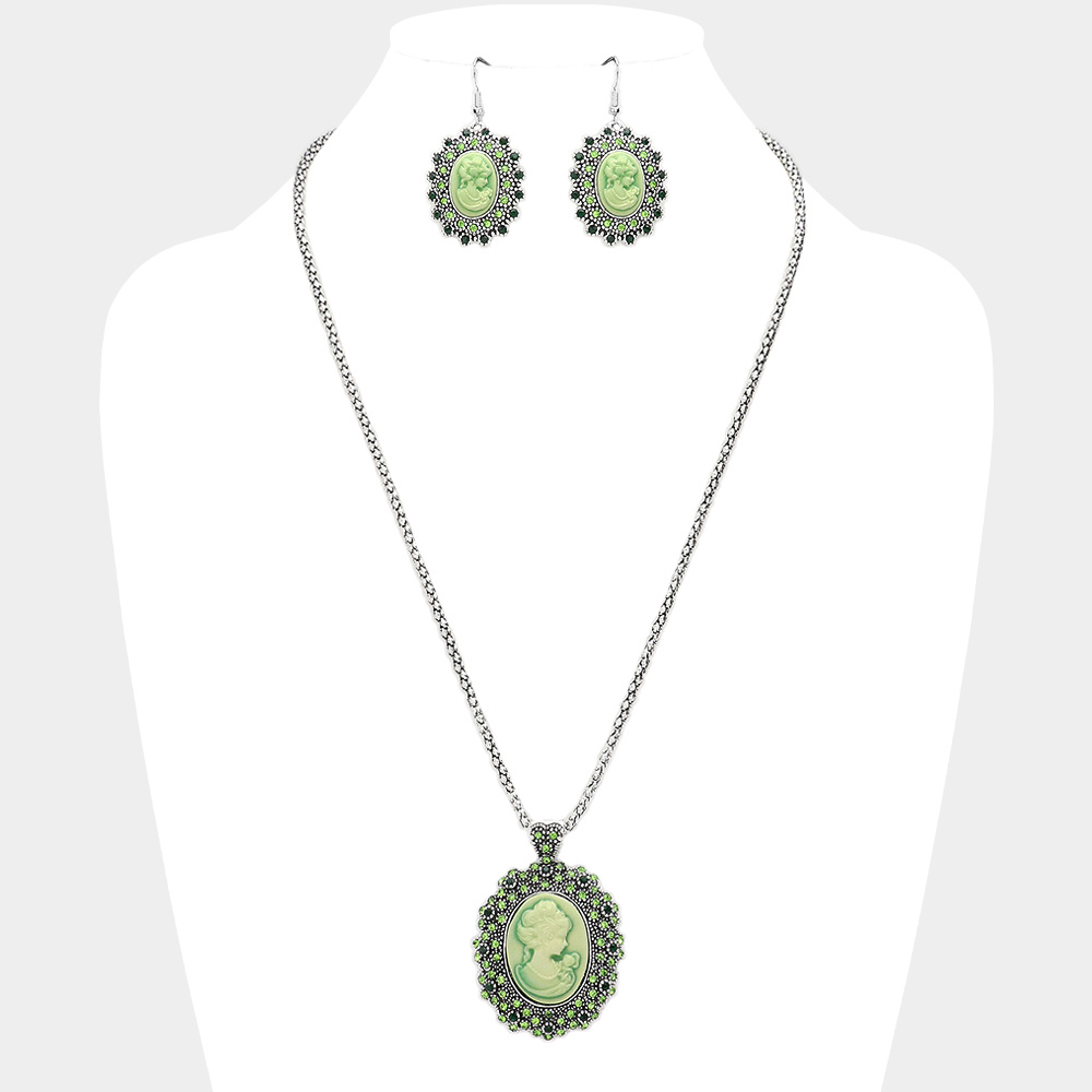 • Timeless vintage-inspired jewelry set featuring an ornate cameo pendant necklace and matching drop earrings. Detailed with intricate frames, this elegant set adds a refined, classic touch to both everyday wear and formal occasions.