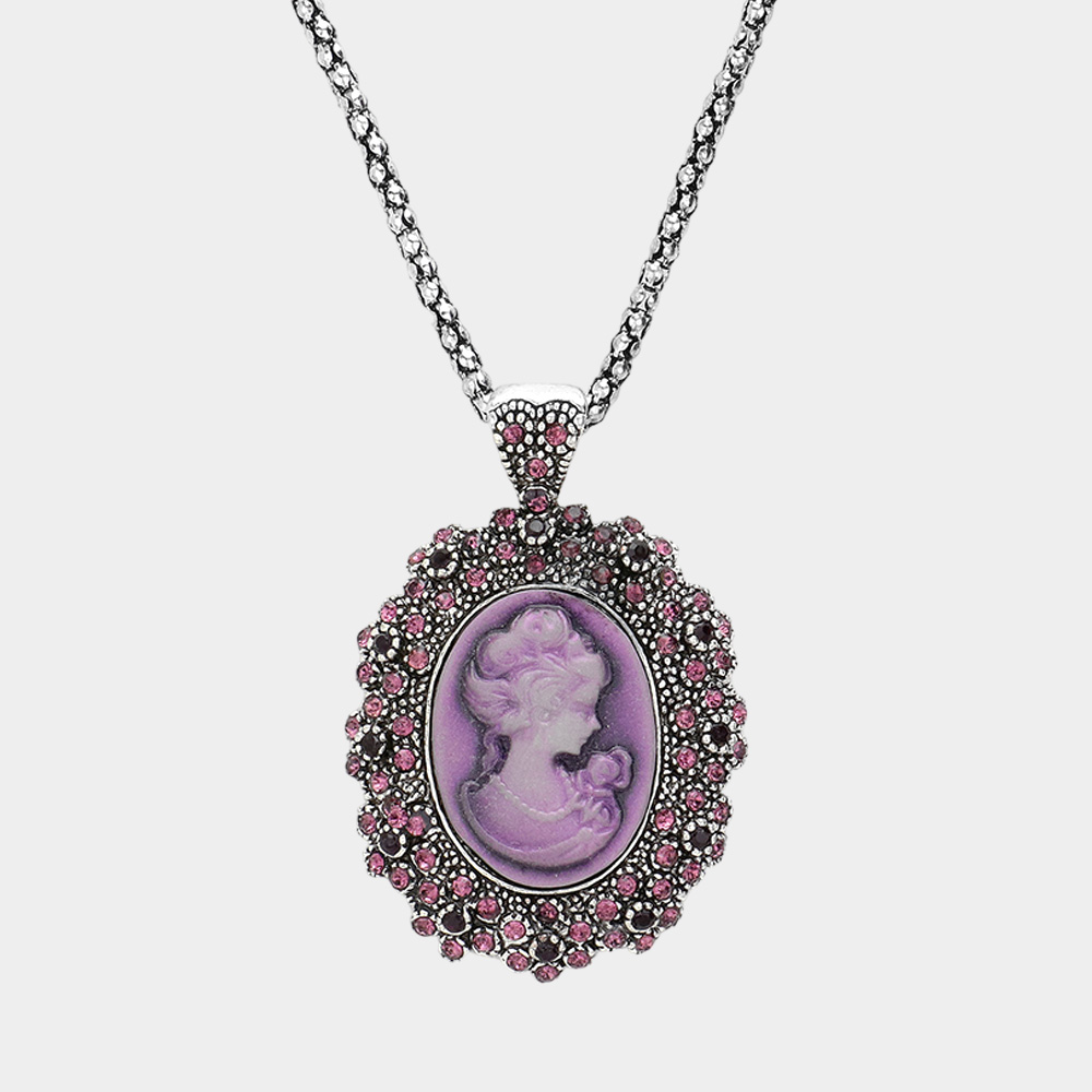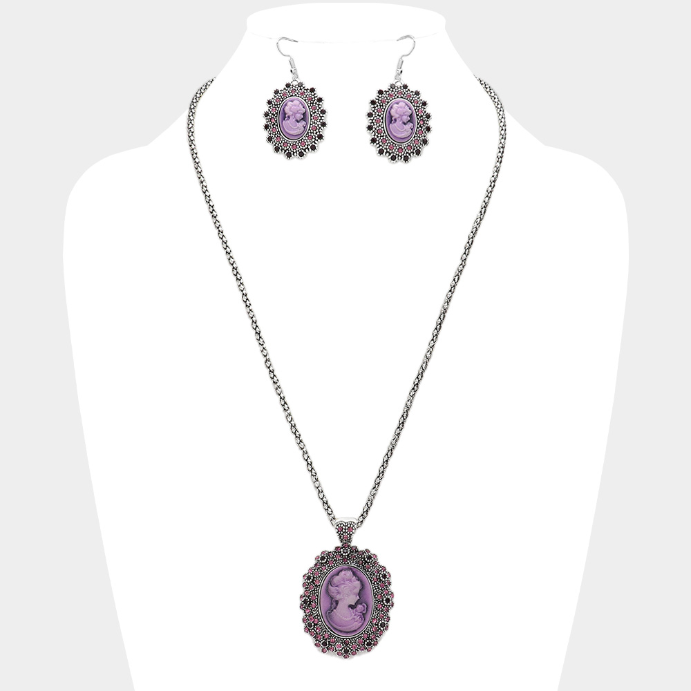 Details • Necklace Size : 25" + 2.75" L • Pendant Size : 1.6" X 2.25" • Earrings Size : 2.1" L • Timeless vintage-inspired jewelry set featuring an ornate cameo pendant necklace and matching drop earrings. Detailed with intricate frames, this elegant set adds a refined, classic touch to both everyday wear and formal occasions. • Lead and Nickel Compliant