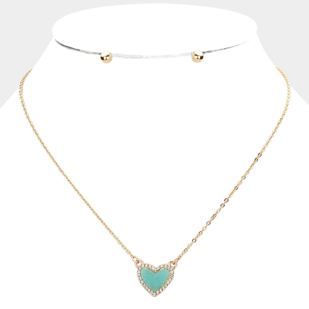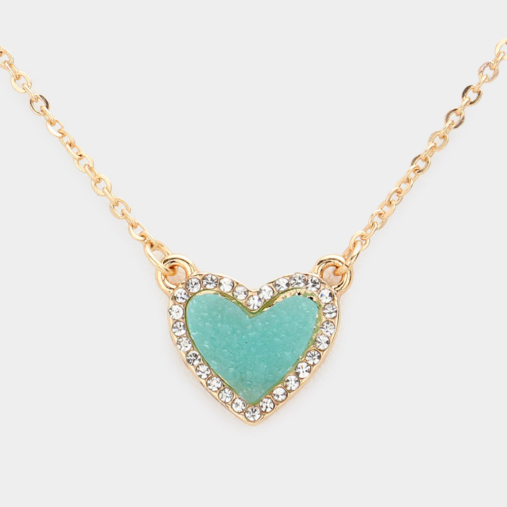 Rhinestone Trimmed Druzy Heart Pendant Necklace