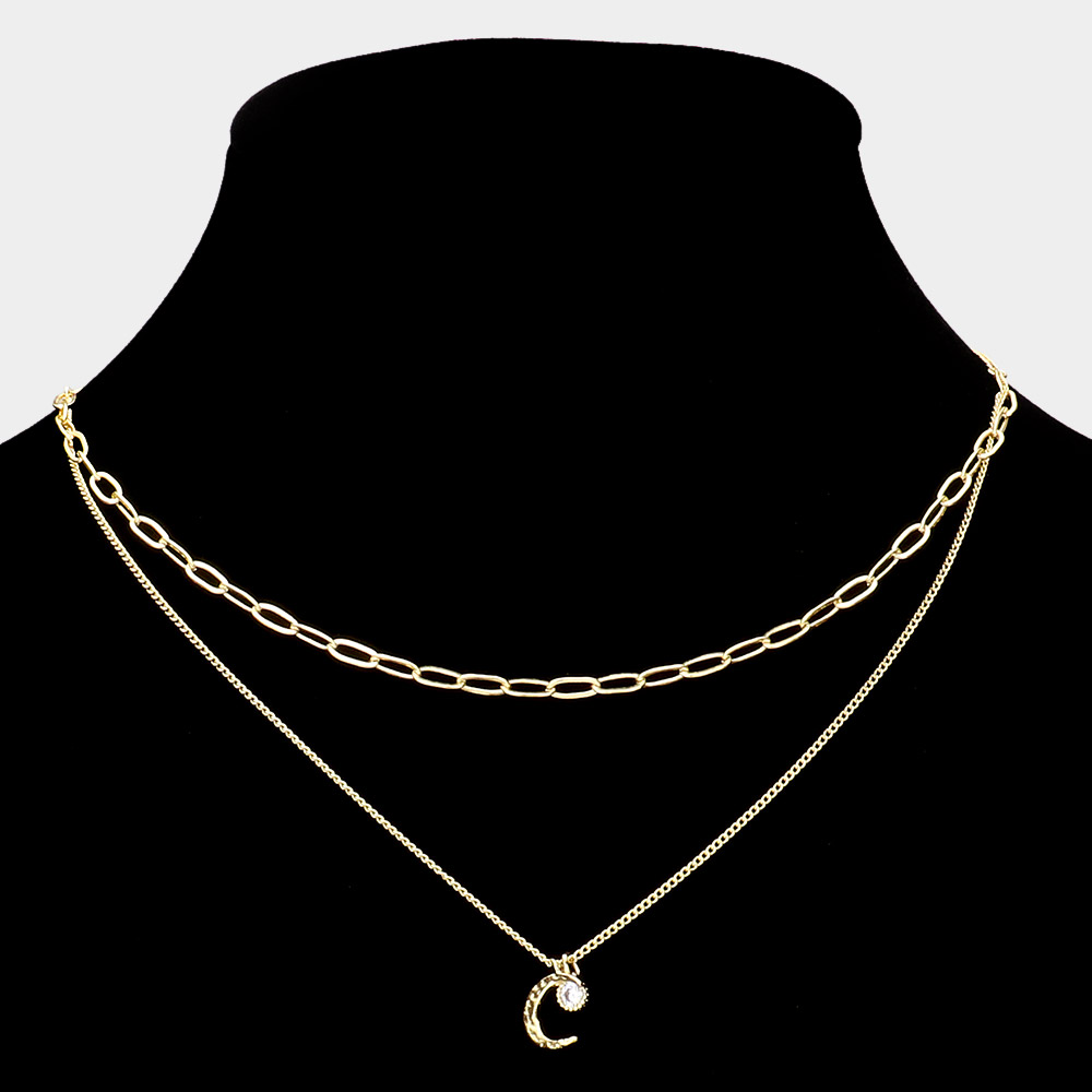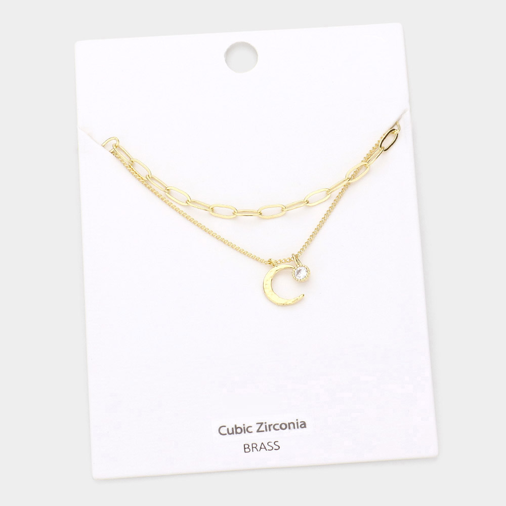 Round CZ Brass Metal Crescent Moon Pendant Double Layered Necklace