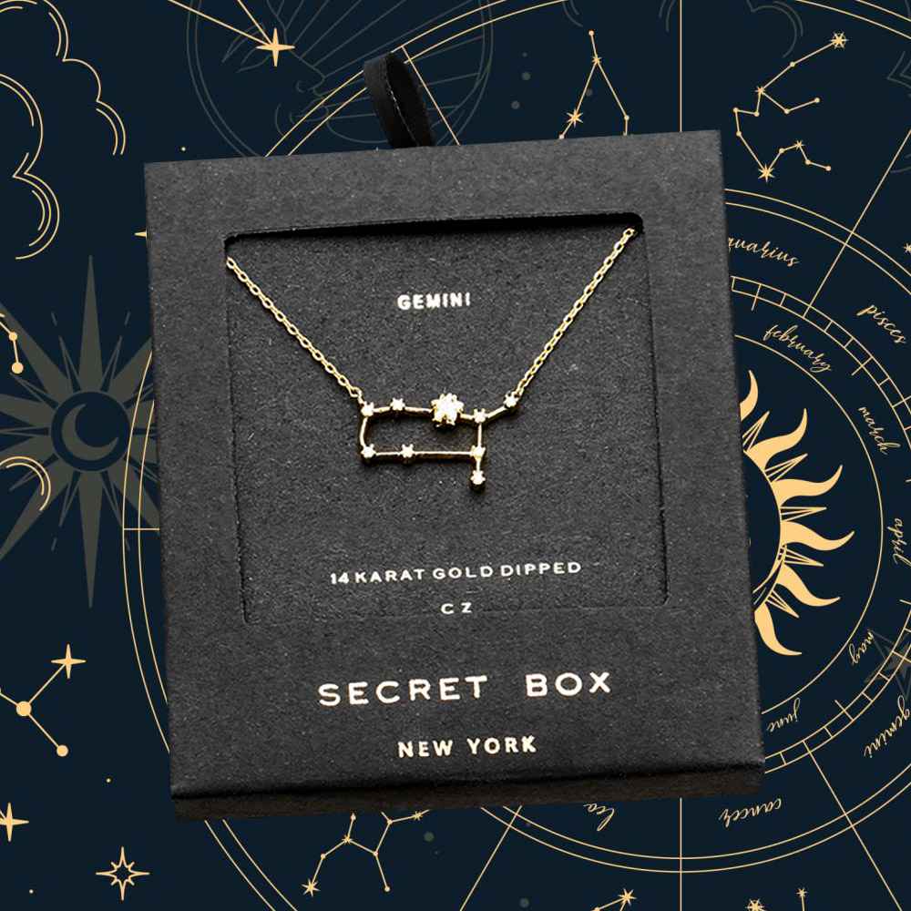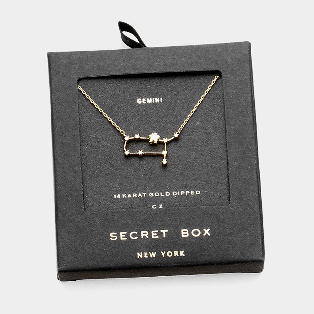 • Gemini constellation necklace dipped in 14K gold with sparkling CZ accents. A stylish zodiac gift, packaged in Secret Box New York's signature box.