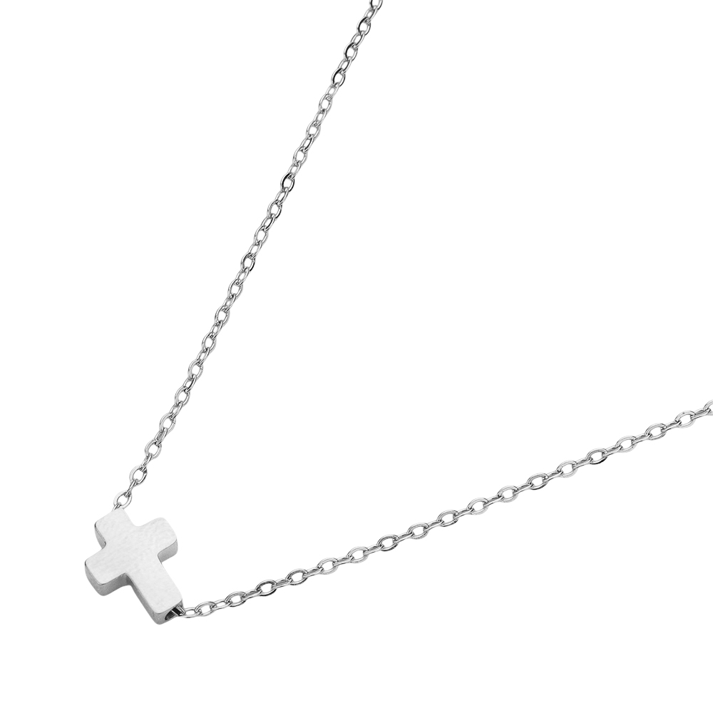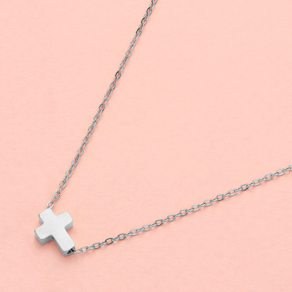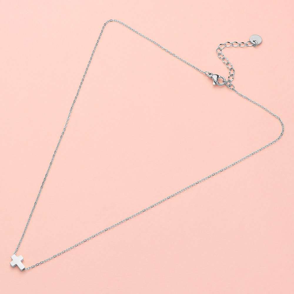 Details • Necklace Size : 16" + 2" L • Pendant Size : 0.3" X 0.3" • Water Resistance • Refined and versatile, this minimalist cross pendant necklace is designed with a sleek chain and polished cross charm. A timeless accessory that pairs effortlessly with casual and formal styles, making it a meaningful addition to any jewelry collection. • Hypoallergenic • Stainless Steel