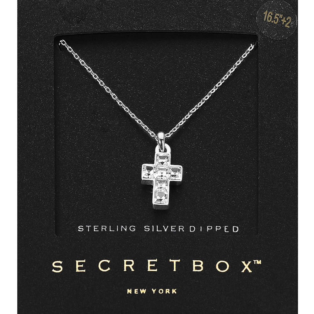 Details • Necklace Size : 16.5" + 2" L • Pendant Size : 0.4" X 0.75" • Embrace timeless elegance with this sterling silver dipped CZ cross necklace. The radiant pendant features a geometric arrangement of sparkling cubic zirconia, blending faith and sophistication in a refined design that’s perfect for layering or gifting. • Sterling Silver Dipped