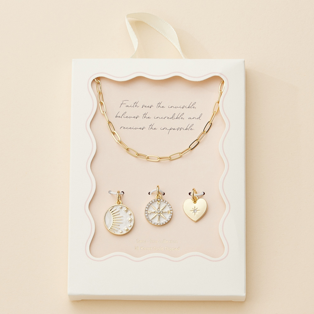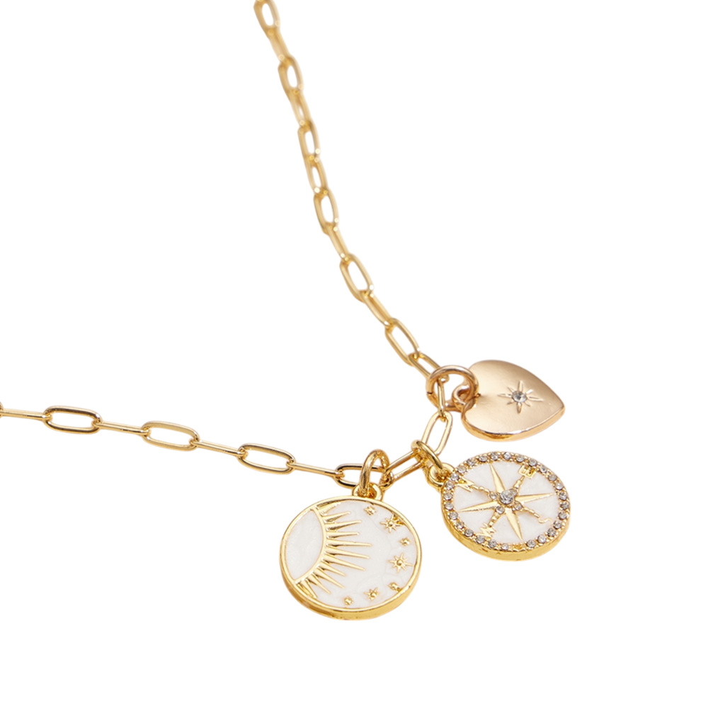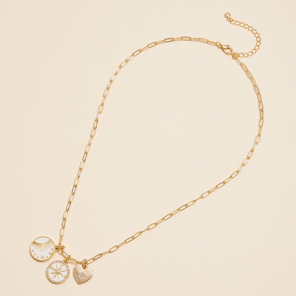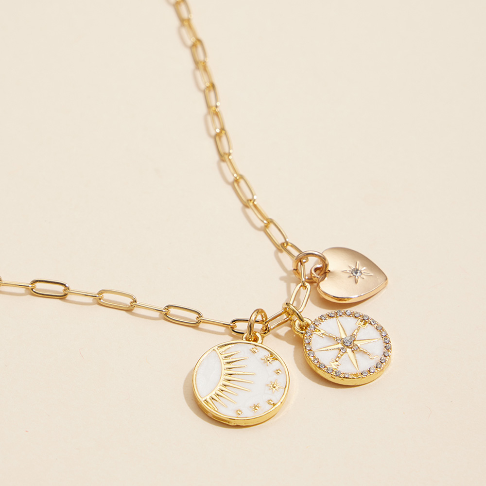 Semi Fine Collection - 18K Gold Dipped Bras Metal Stone Pointed Heart Enamel Sun and Star Medallion Charm Pendant Paperclip Chain Necklace