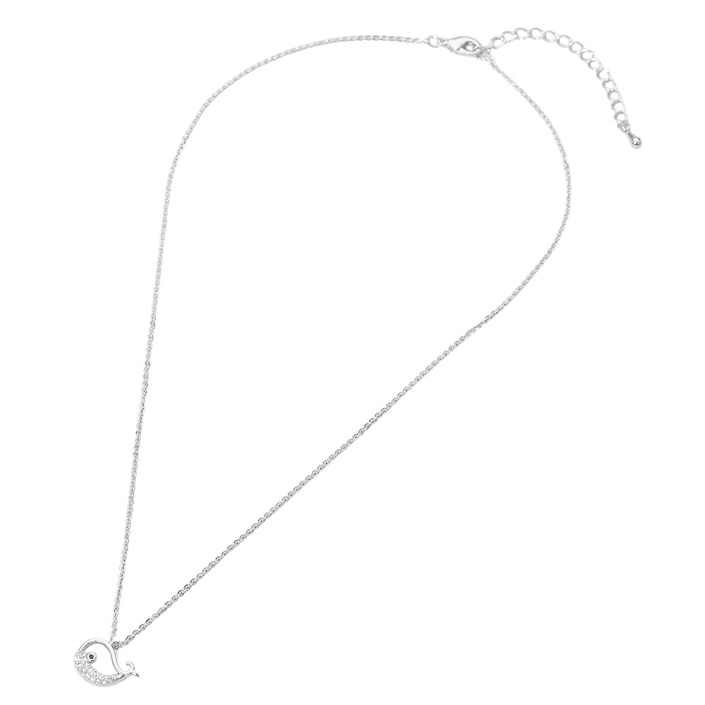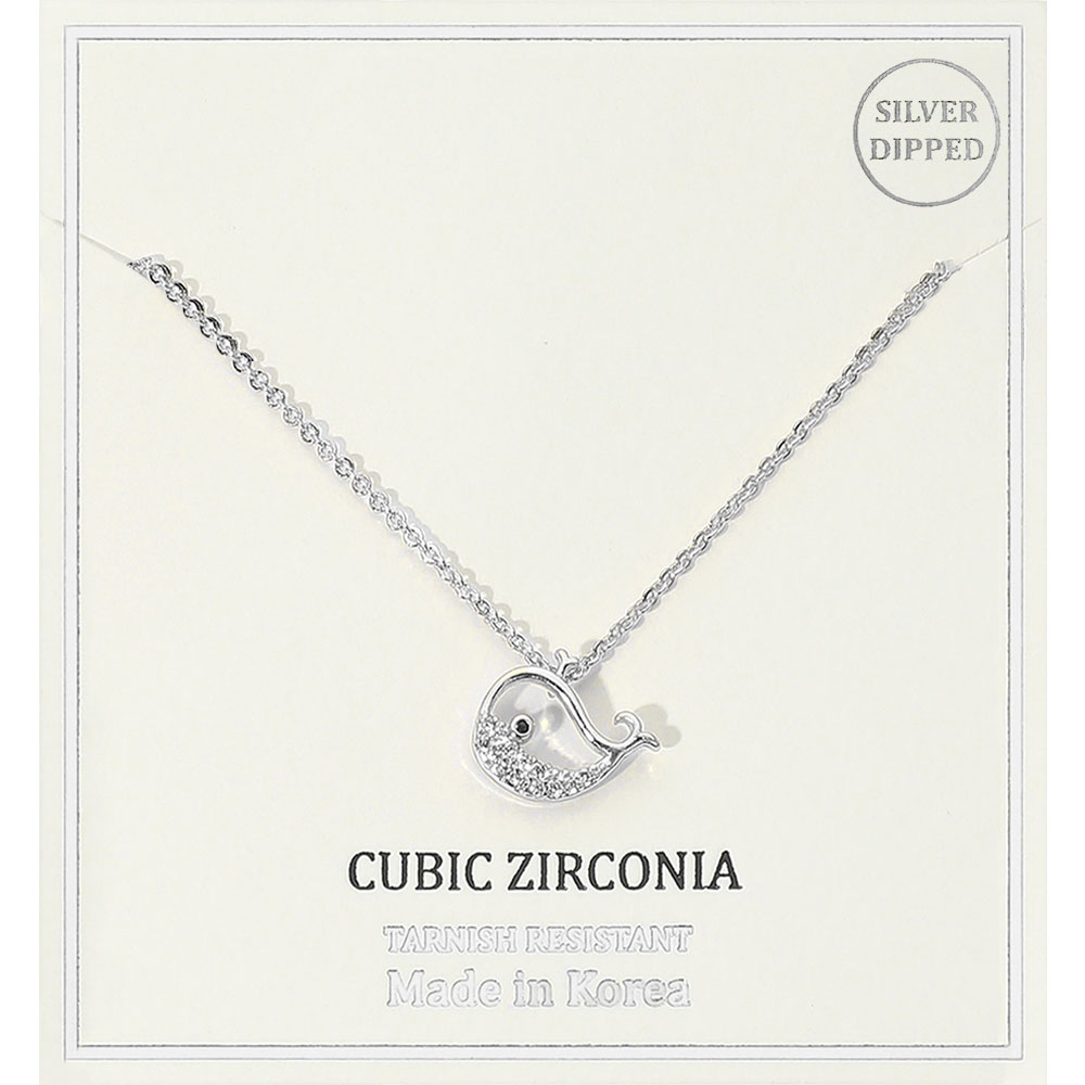 Details • Necklace Size : 16" + 2.5" L • Pendant Size : 0.5" X 0.4" • Tarnish resistant • Necklace featuring a playful whale-shaped pendant accented with sparkling cubic zirconia. A charming and whimsical accessory that adds personality and shine to your daily or vacation look. • Lead and Nickel Compliant • Made In Korea • CZ Cubic Zirconia • Sterling Silver Dipped