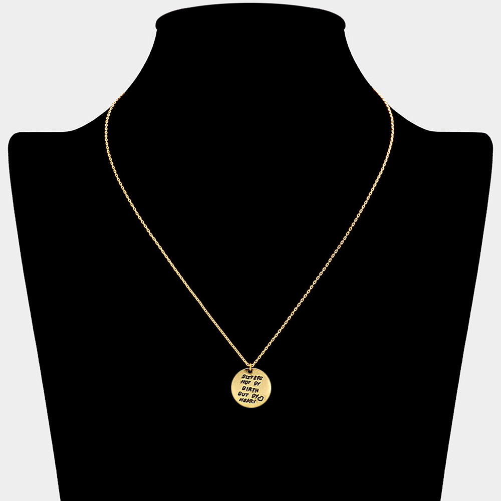 Details • Necklace Size : 16" + 3" L • Pendant Size : 0.7" X 0.7" • Pouch Bag Size : 2.75" X 3.5" • Celebrate the special bond of sisterhood with this engraved pendant necklace featuring the heartfelt message “Sisters not by birth but by heart.” A thoughtful accessory and keepsake, it’s perfect for gifting to a beloved sister or friend who feels like family. Comes with a pouch for easy gifting. • Lead and Nickel Compliant
