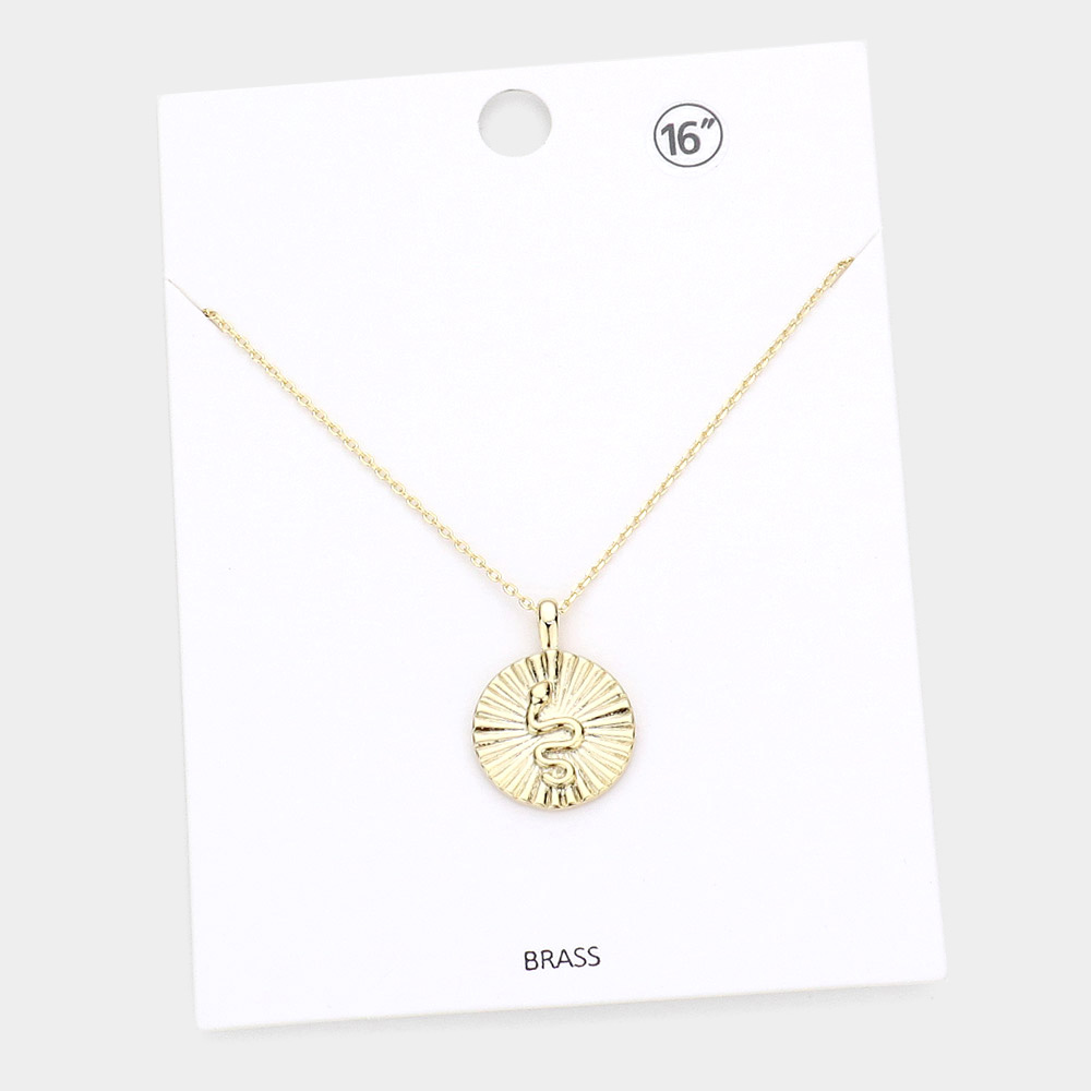 Snake Accented Textured Brass Metal Round Pendant Necklace
