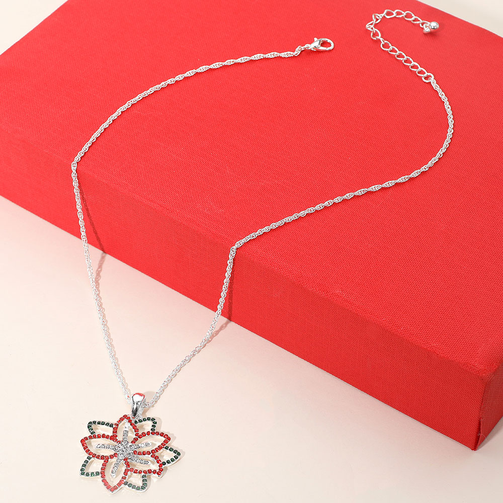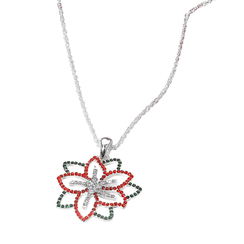 Details • Necklace Size : 18" + 3" L • Pendant Size : 1.5" X 1.75" • Celebrate the season with a dazzling flower pendant necklace, styled with festive rhinestones. A sparkling statement piece perfect for holiday gatherings, winter events, or adding cheer to any outfit. • Lead and Nickel Compliant