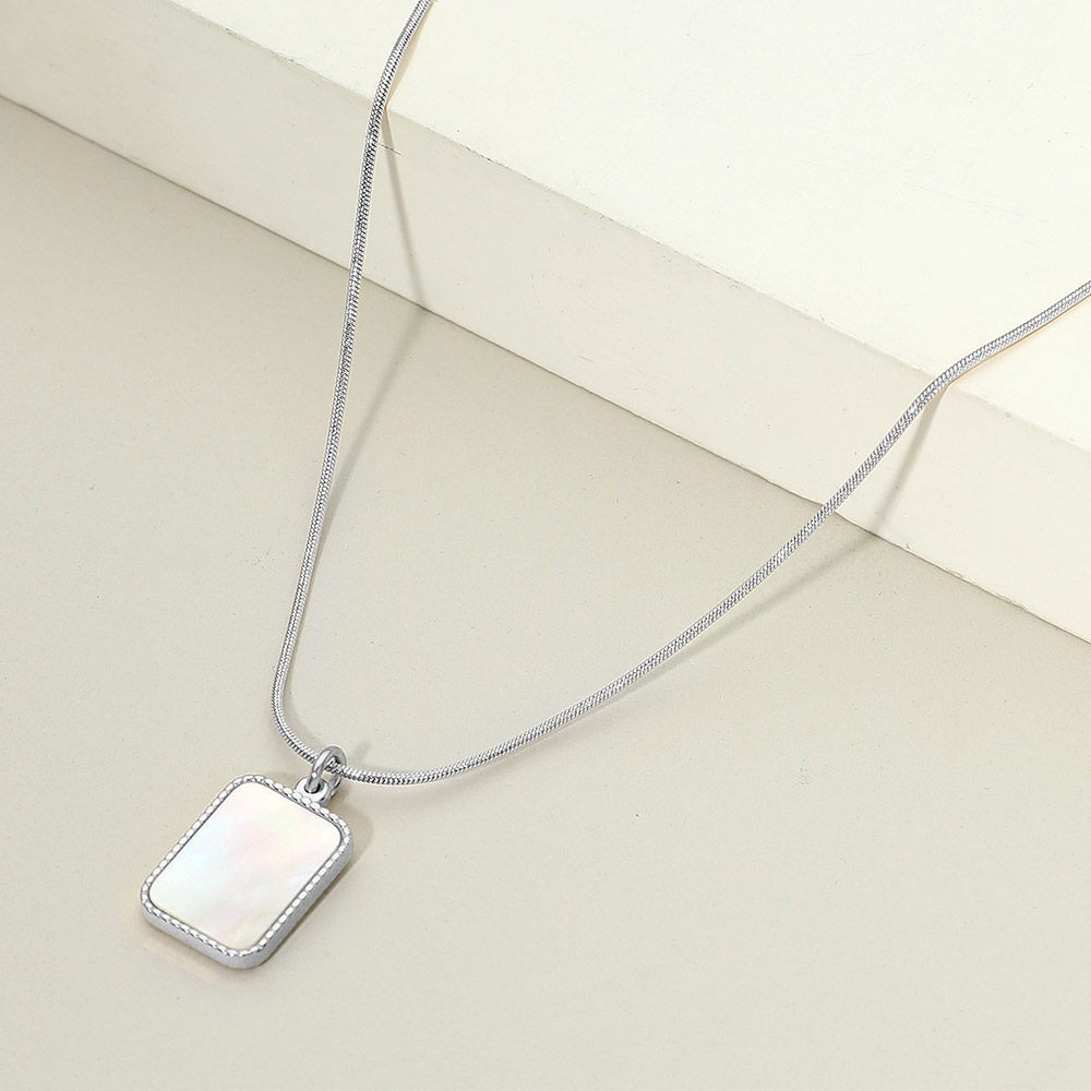Details • Necklace Size : 16" + 2" L • Pendant Size : 0.6" X 0.5" • This stainless steel necklace showcases a refined rectangular pendant framed in a sleek finish. Its timeless and minimal design makes it perfect for layering or wearing solo, adding a touch of sophistication and everyday elegance to both casual and formal ensembles. • Stainless Steel