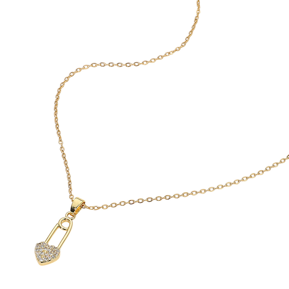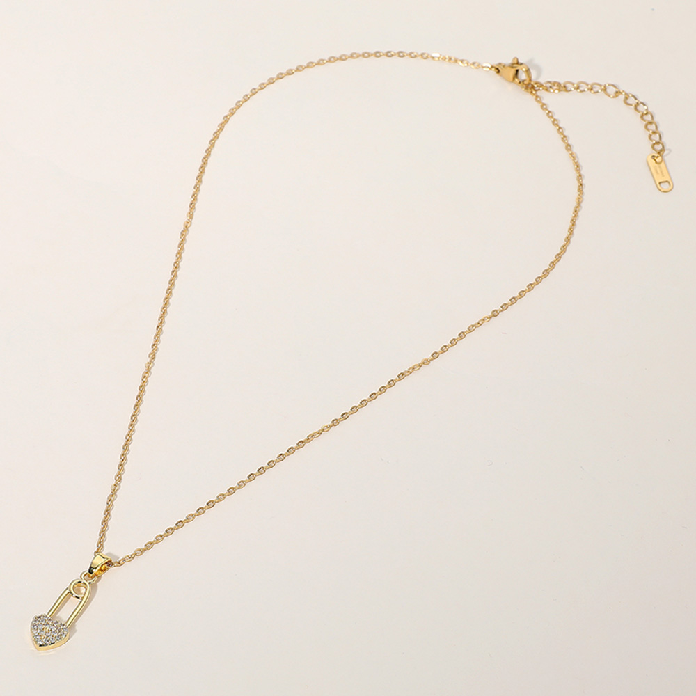 Stainless Steel Stone Paved Heart Safety Pin Pendant Necklace