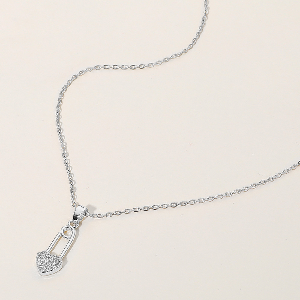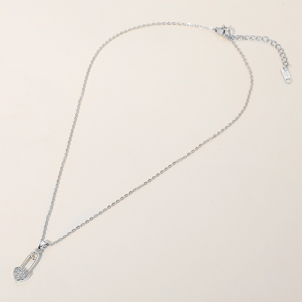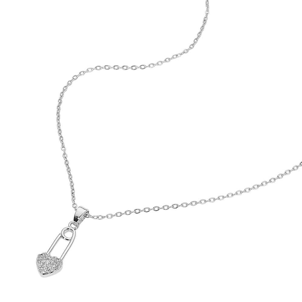 Stainless Steel Stone Paved Heart Safety Pin Pendant Necklace