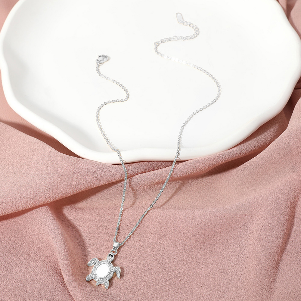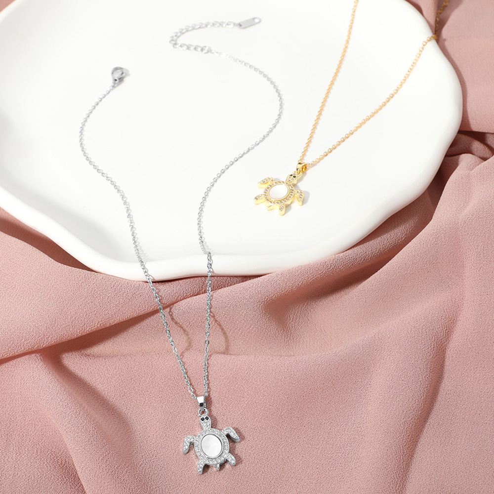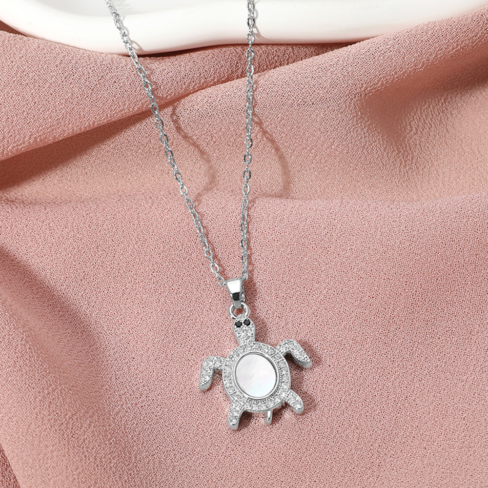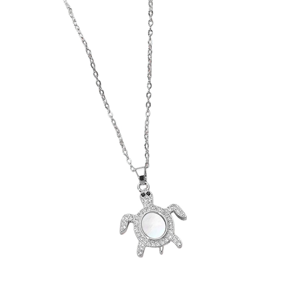 Stainless Steel Stone Paved Mother of Pearl Turtle Pendant Necklace