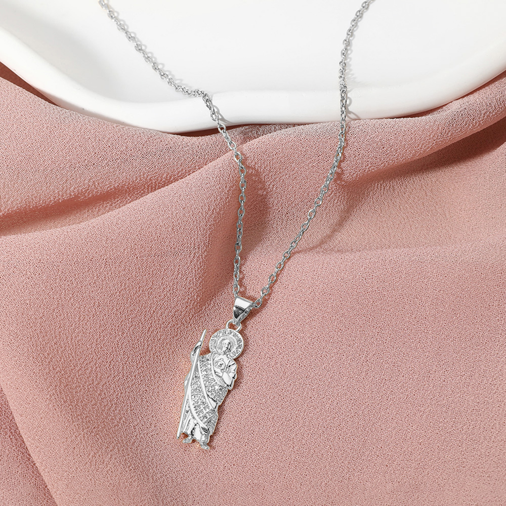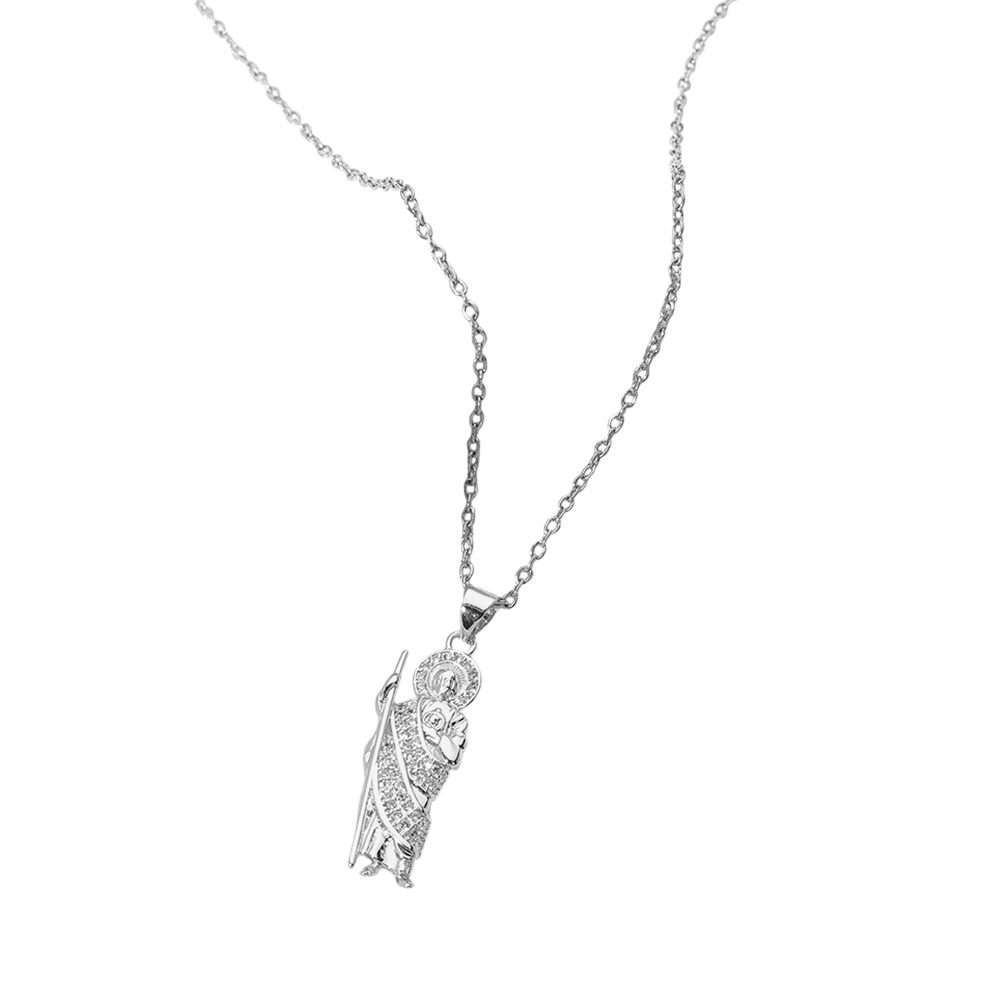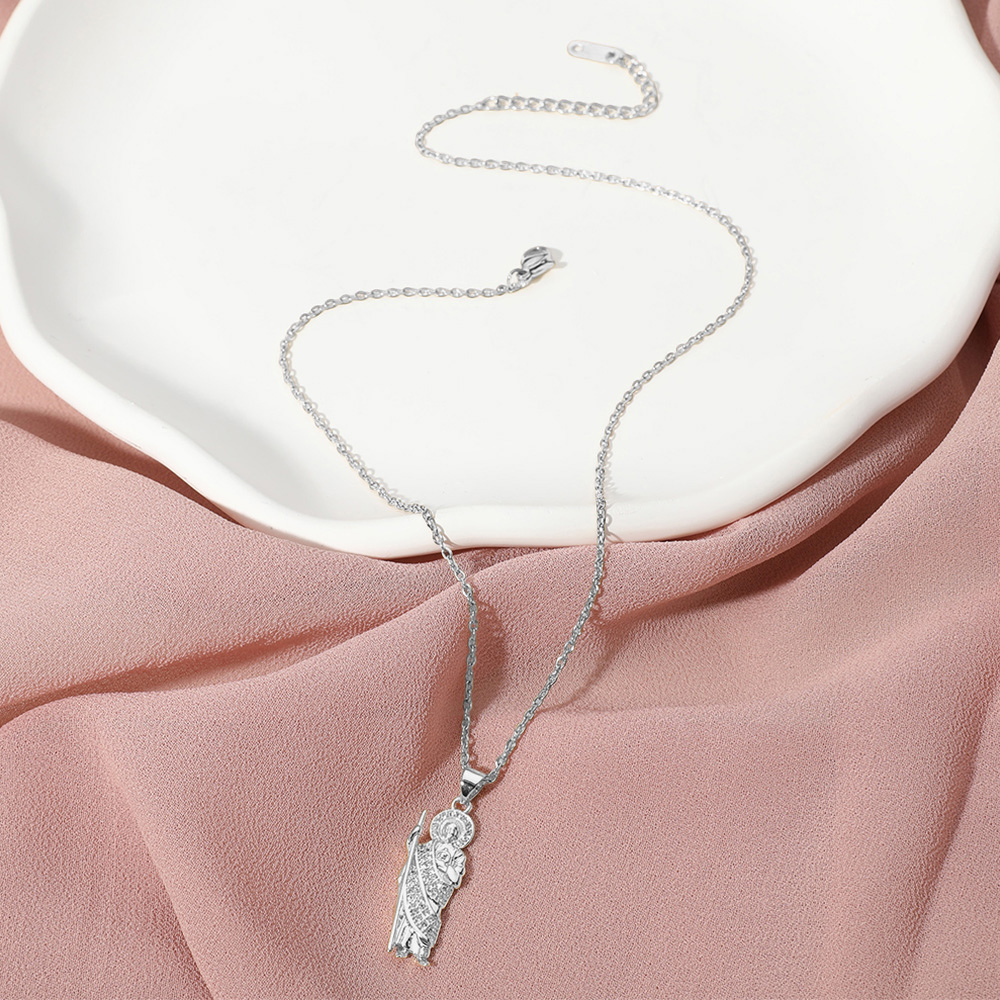 Stainless Steel Stone Paved San Judas Pendant Necklace