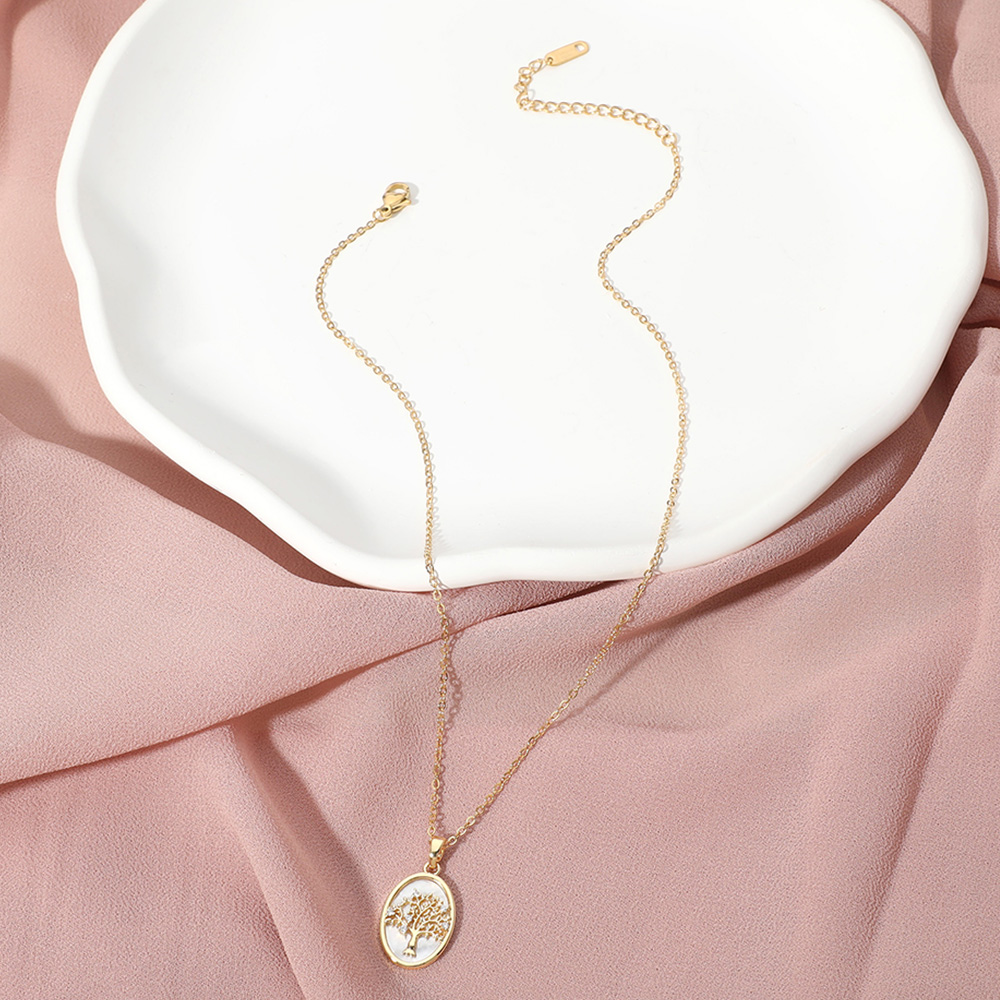 Stainless Steel Tree of Life Embossed Mother of Pearl Oval Pendant Necklace