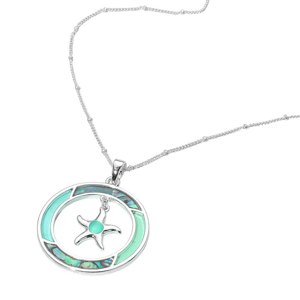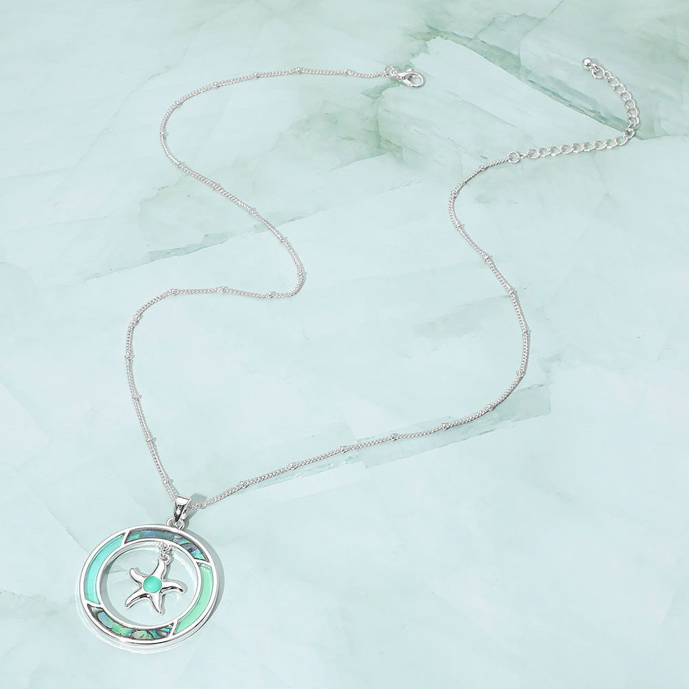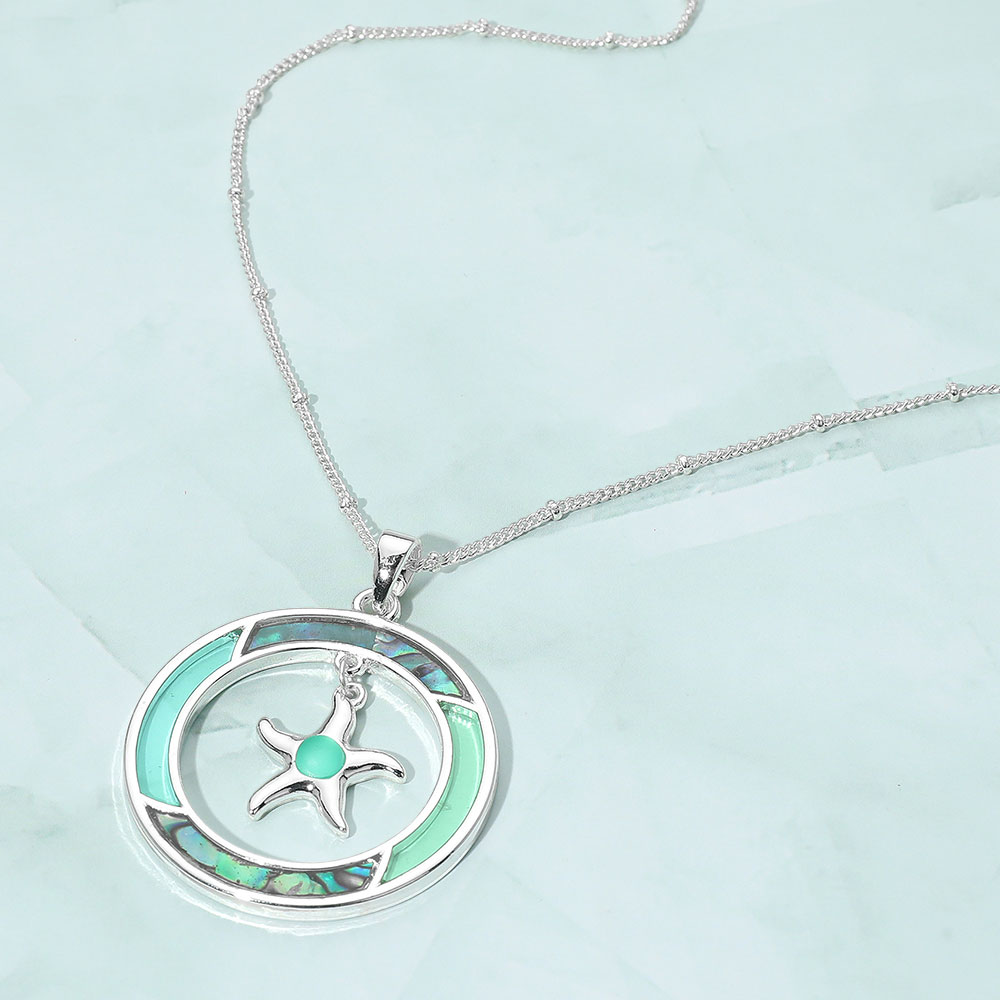Details • Necklace Size : 22" + 3.25" L • Pendant Size : 1.5" X 2" • Embrace ocean vibes with this elegant silver starfish pendant necklace, featuring a circular frame with abalone shell and mint enamel inlays. The dangling starfish charm adds a whimsical beachy touch. Perfect for coastal-inspired outfits, summer looks, or sea lovers. Lightweight and stylish for everyday wear. • Lead and Nickel Compliant