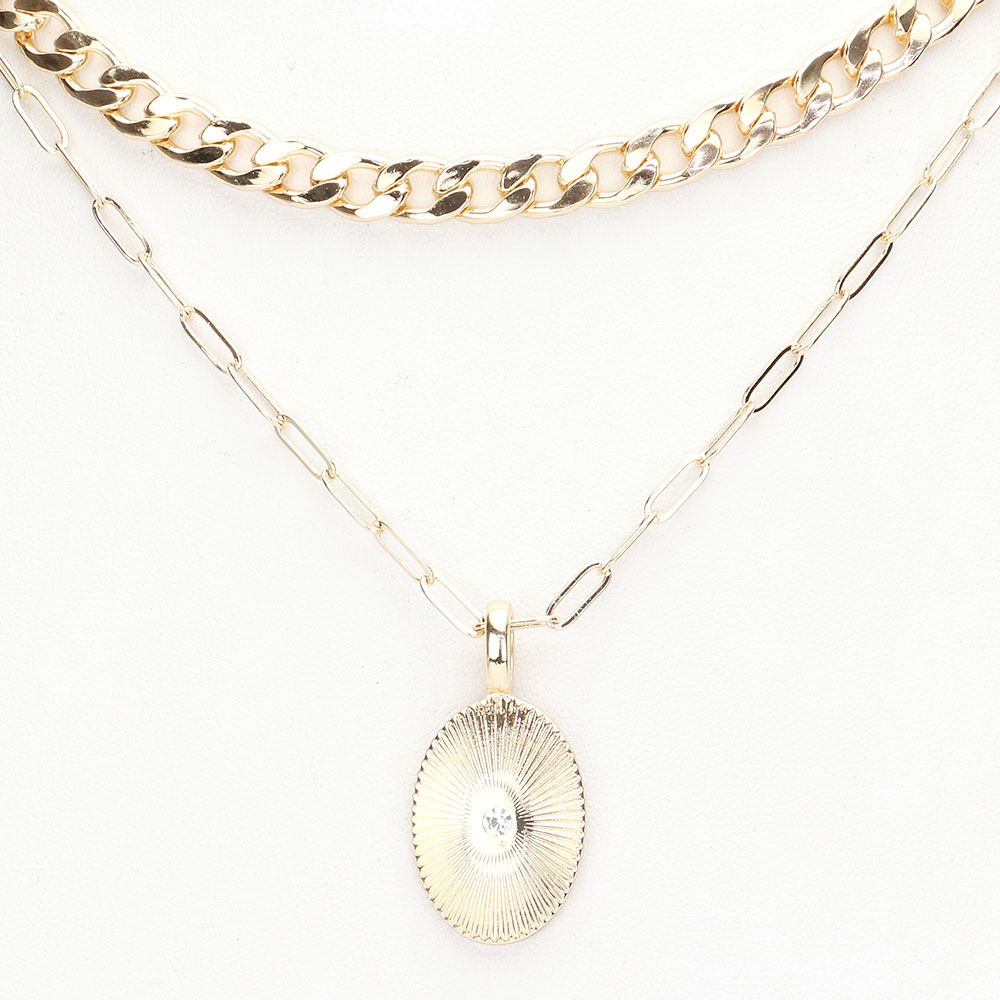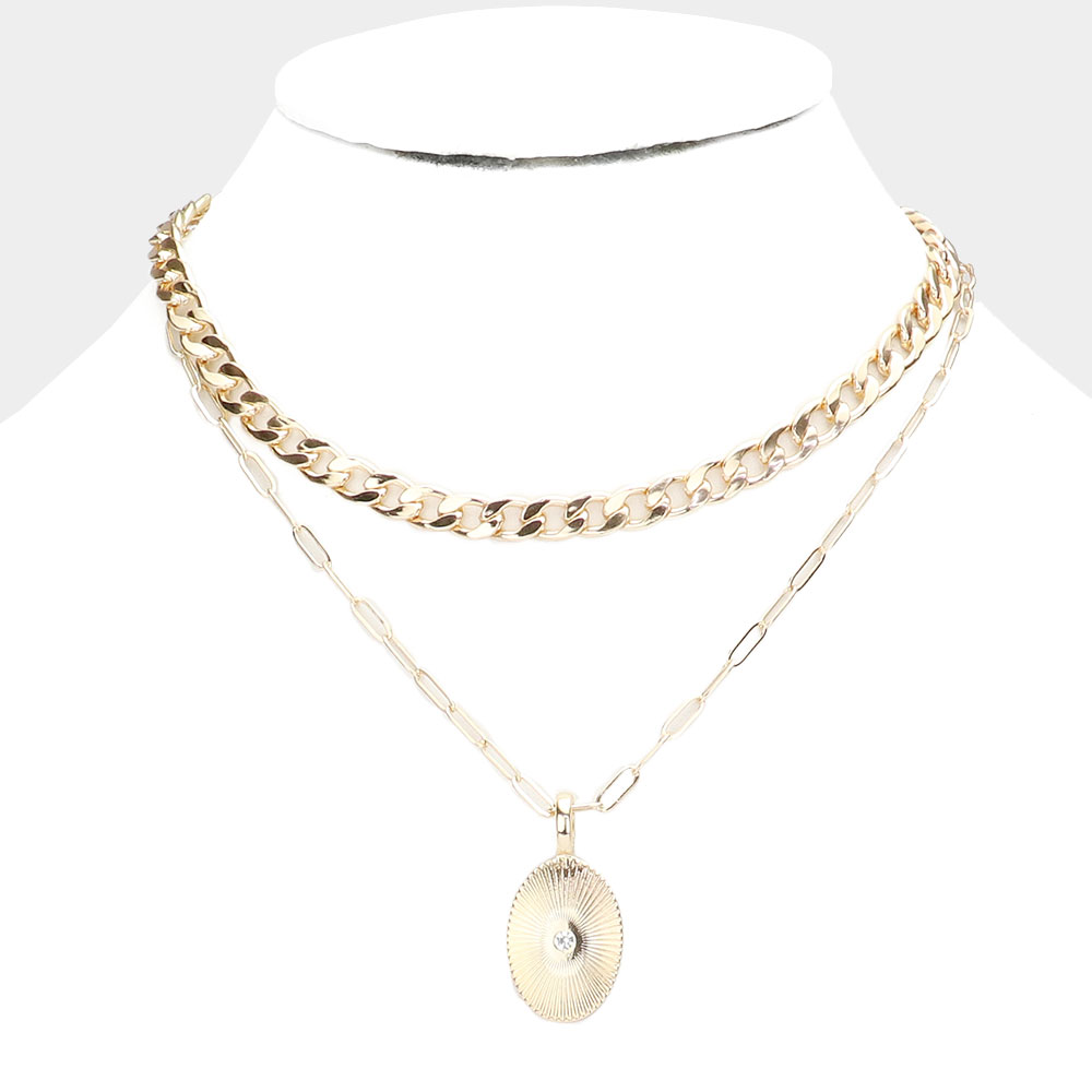 Stone Centered Metal Oval Pendant Double Layered Necklace