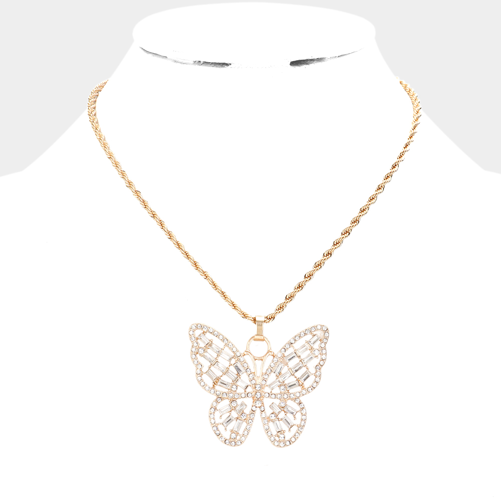 Stone Embellished Metal Butterfly Pendant Necklace