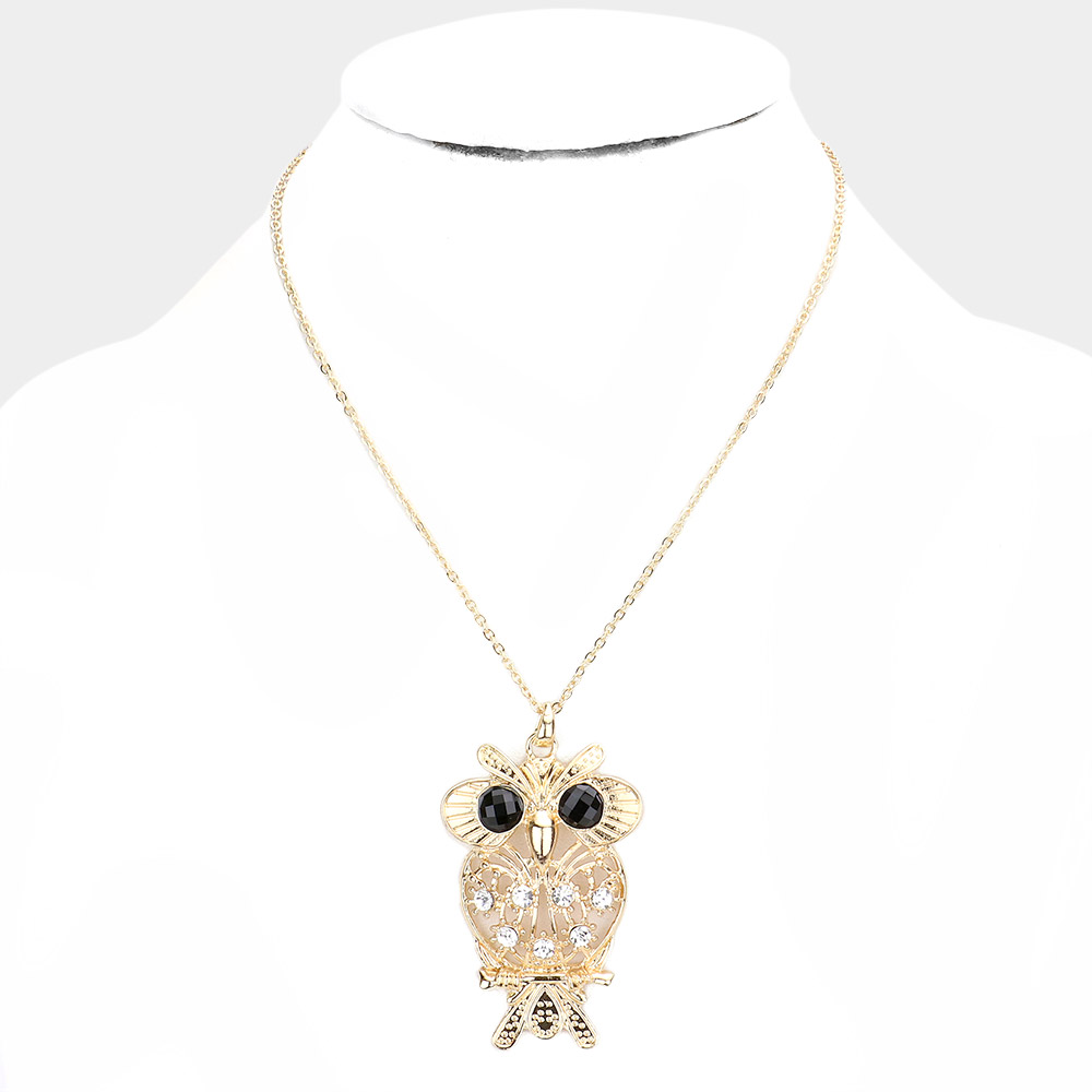 Stone Embellished Metal Owl Pendant Necklace