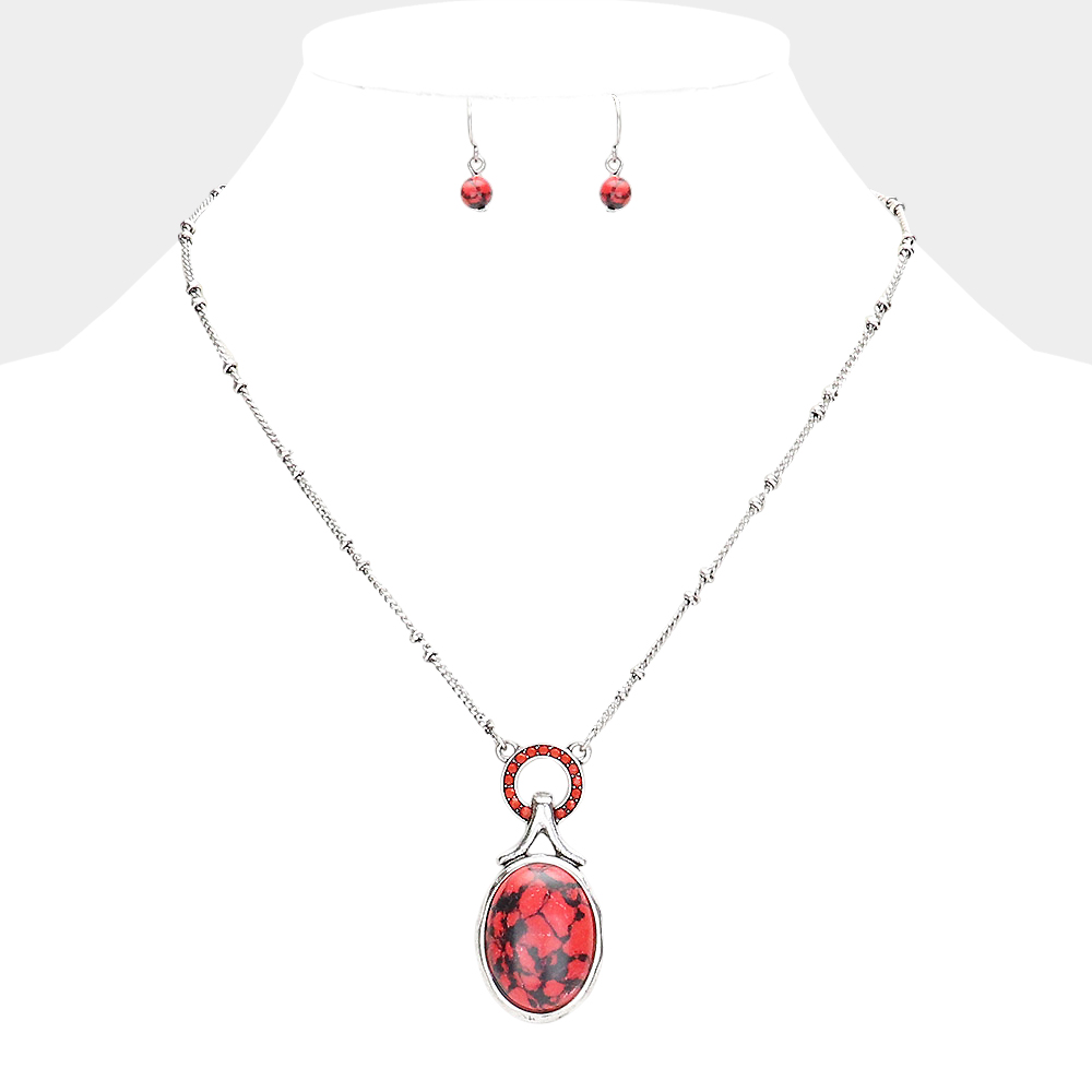 Stone Embellished Open Circle Oval Natural Stone Pendant Necklace
