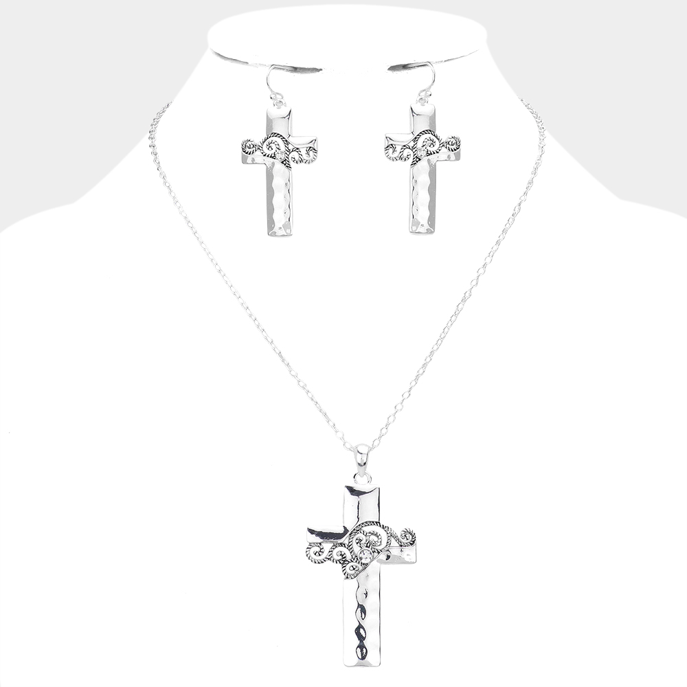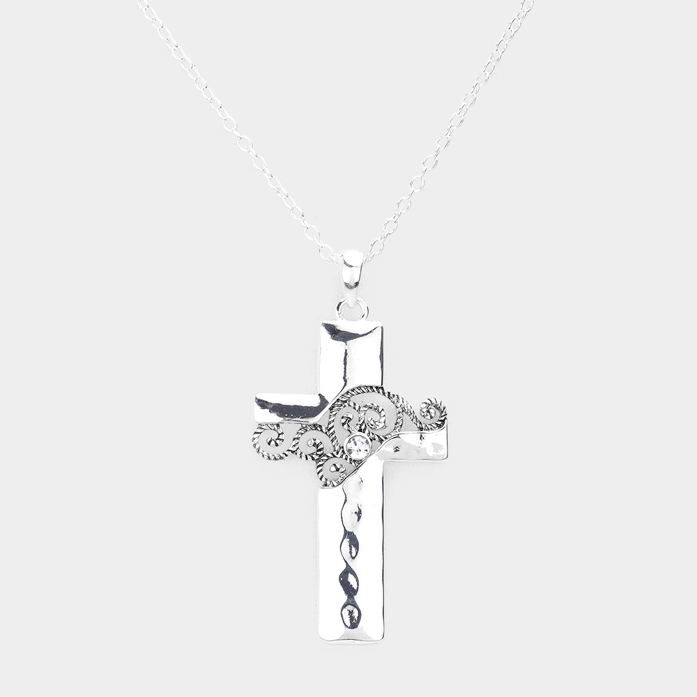 Stone Embellished Swirl Detailed Metal Cross Pendant Necklace