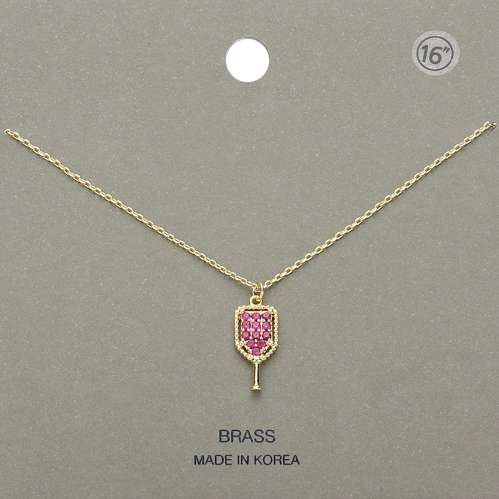 Stone Paved Brass Metal Pickleball Paddle Pendant Necklace