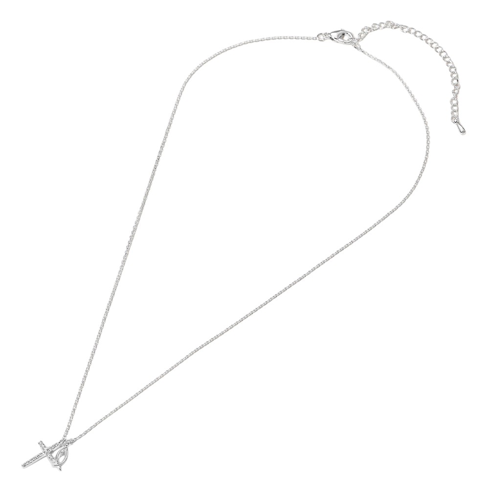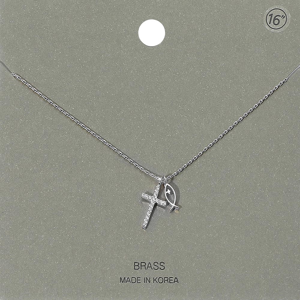 Details • Necklace Size : 16" + 3" L • Pendant Size : 0.7" L • Elegant necklace featuring a cross pendant accented with sparkling details and a symbolic fish charm. A meaningful jewelry piece blending faith and style, perfect for everyday wear or as a thoughtful gift. Lightweight, versatile, and designed to complement both casual and formal outfits. • Lead and Nickel Compliant • Made In Korea • Brass