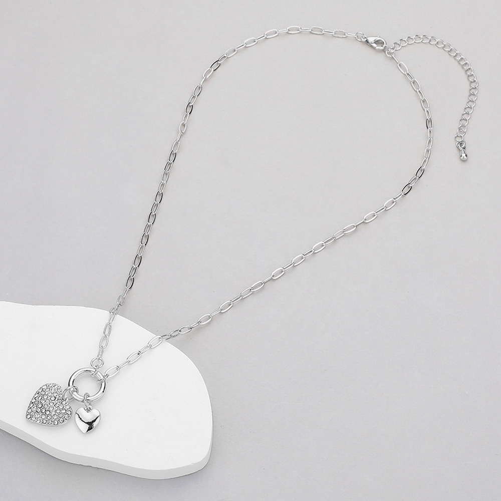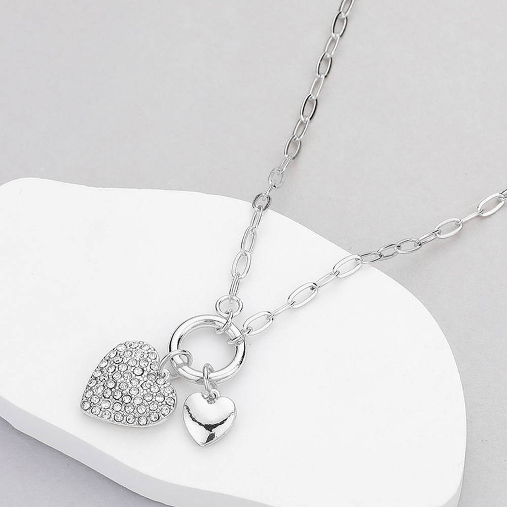Stone Paved Metal Heart Charms Pendant Paperclip Chain Necklace