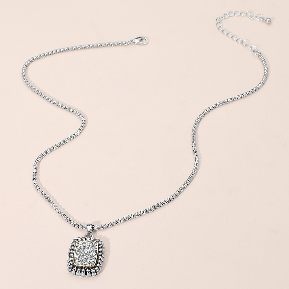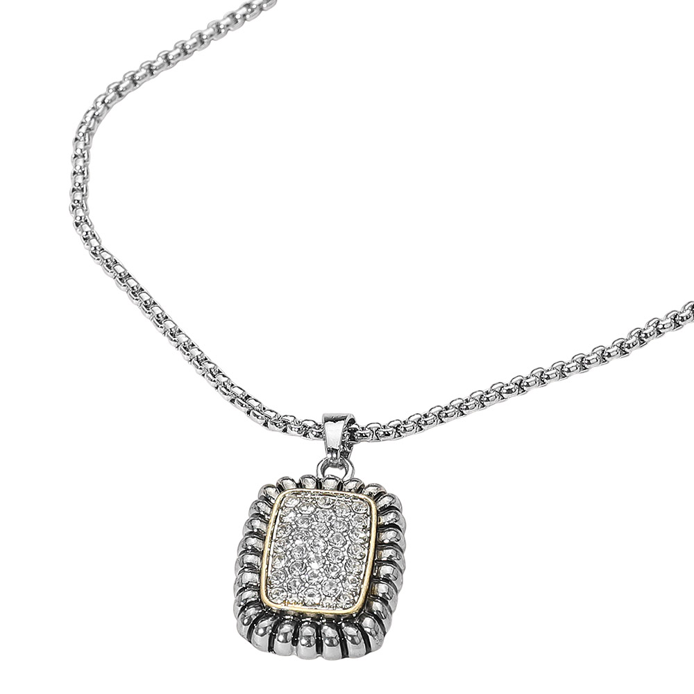 Details • Necklace Size : 18" + 3.25" L • Pendant Size : 0.75" X 1.2" • Elegant rectangular pendant necklace featuring a textured beaded frame and shimmering crystal detail. A timeless design that adds sophistication to both casual and formal looks, offering a refined accent for modern and classic styles alike. • Lead and Nickel Compliant