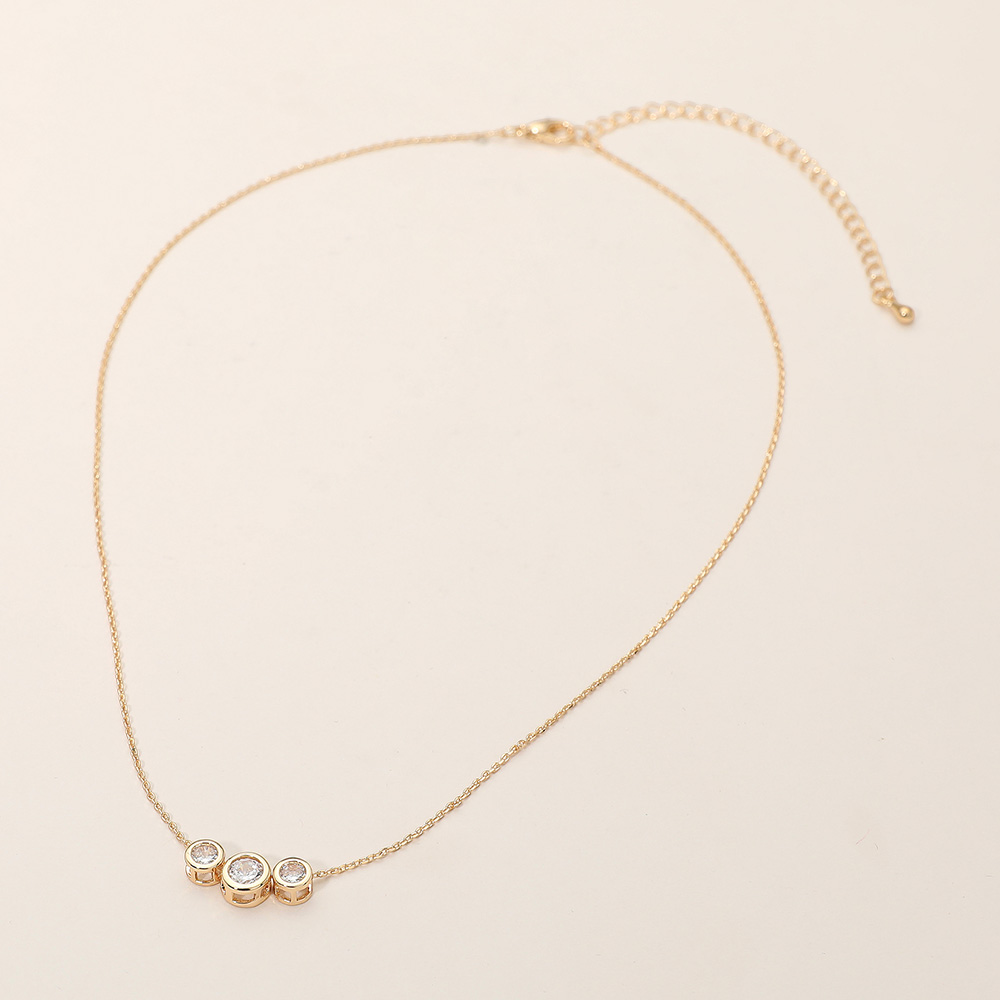 Details • Necklace Size : 16" + 3.5" L • Pendant Size : 0.5" L • Chic minimalist necklace featuring three bezel-set round charms for a touch of refined sparkle. Perfect for everyday wear or layering with other pieces, this dainty chain adds effortless elegance to any outfit, blending simplicity and sophistication in a timeless modern design. • Brass • Lead and Nickel Compliant
