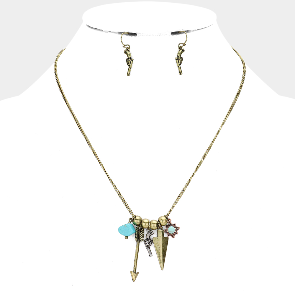Turquoise Stone Accented Arrow & Gun Pendant Necklace