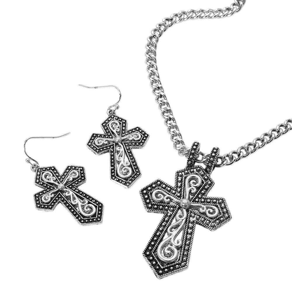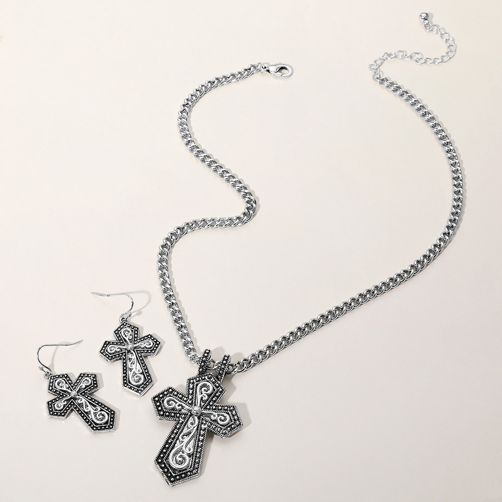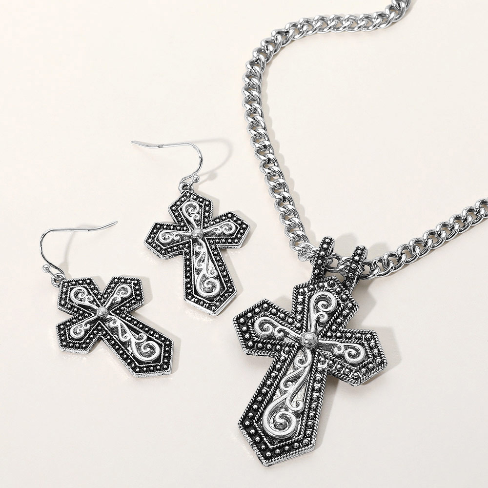 Details • Necklace Size : 18" + 3.25" L • Pendant Size : 1.5" X 2.3" • Earrings Size : 1.8" L • Striking jewelry set featuring a cross pendant necklace with coordinating earrings. Intricate detailing and bold design make it a standout accessory for faith-inspired or statement styling. • Lead and Nickel Compliant