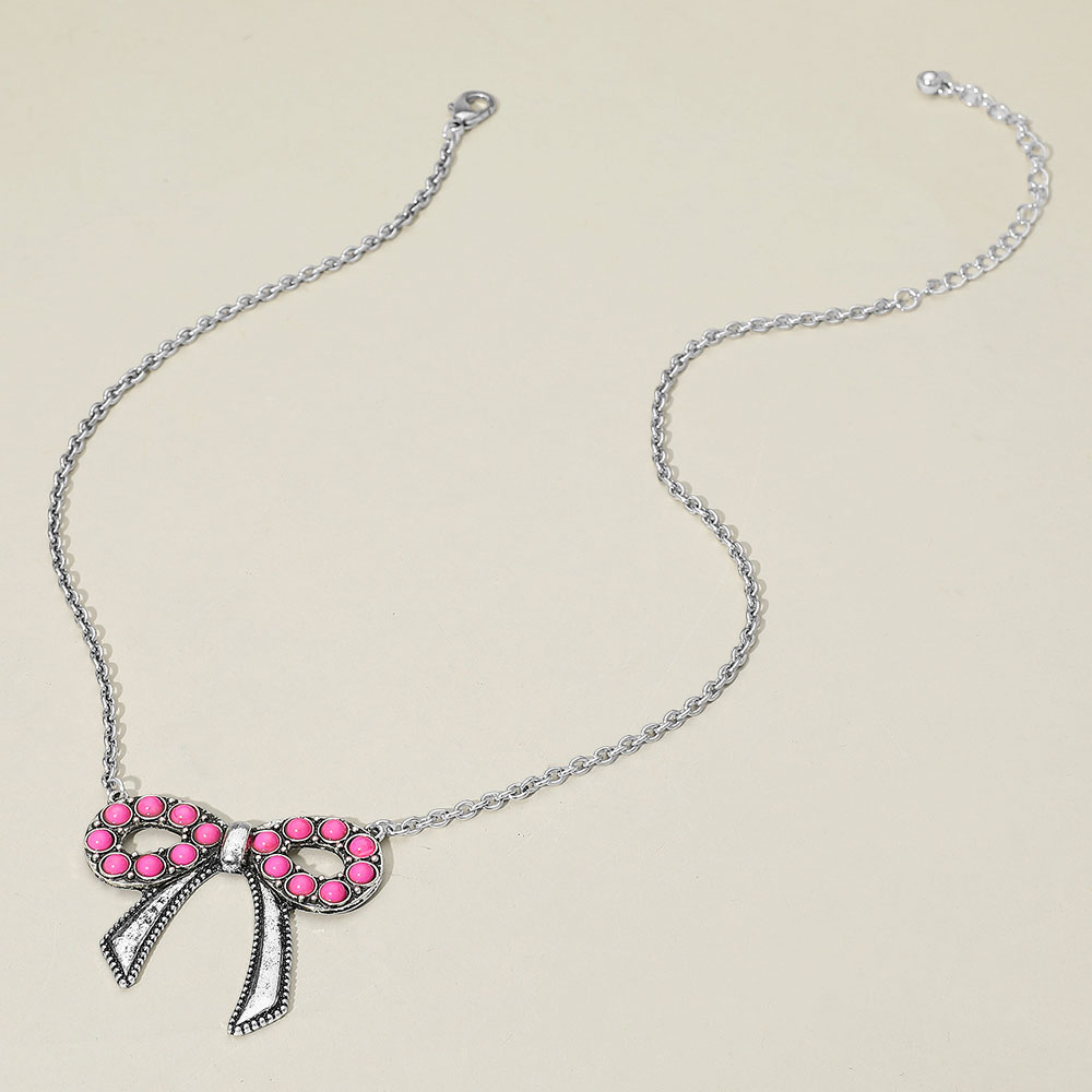 • Elegant bow pendant necklace featuring beaded accents and vintage-style charm. A delicate accessory to add feminine flair to everyday outfits or special occasions, perfect for layering or wearing solo.