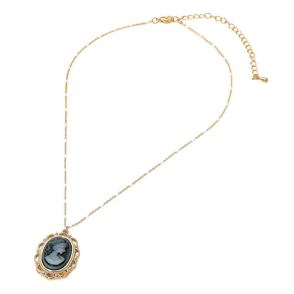 Details • Necklace Size : 14" + 3" L • Pendant Size : 0.75" X 1" • Timeless pendant necklace featuring an intricately framed cameo design. Perfect for adding a touch of vintage elegance to formal attire or gifting to those who appreciate classic, sophisticated style. • Lead and Nickel Compliant