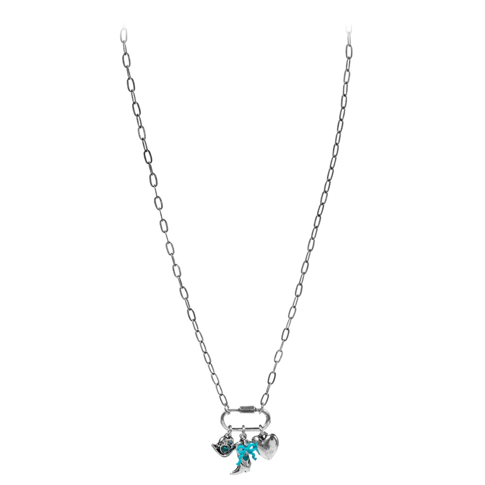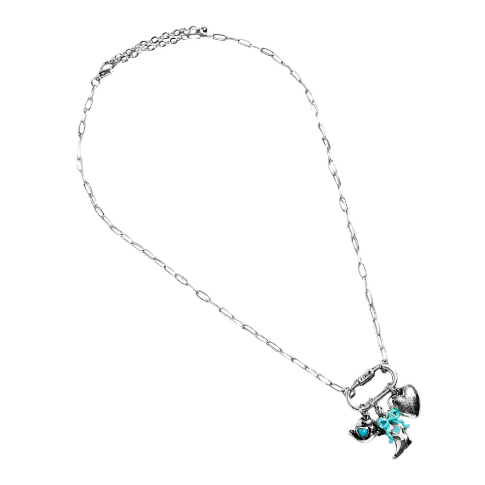 Details • Necklace Size : 16" + 3.25" L • Pendant Size : 1.25" L • Chain necklace showcasing a trio of dangling charms gathered at the center for a playful Western-inspired accent. Designed to add movement and personality, this piece layers effortlessly or stands alone as a subtle statement for everyday wear or styled looks. • Lead and Nickel Compliant