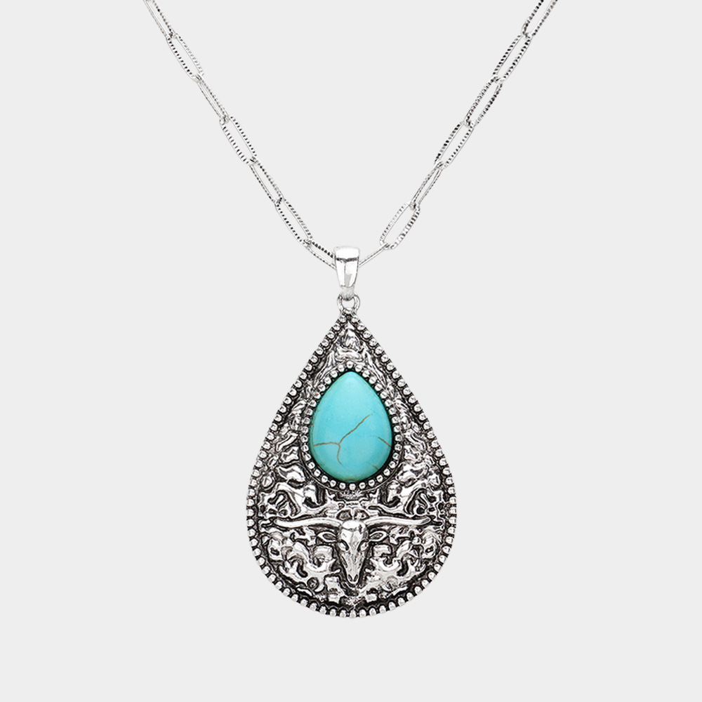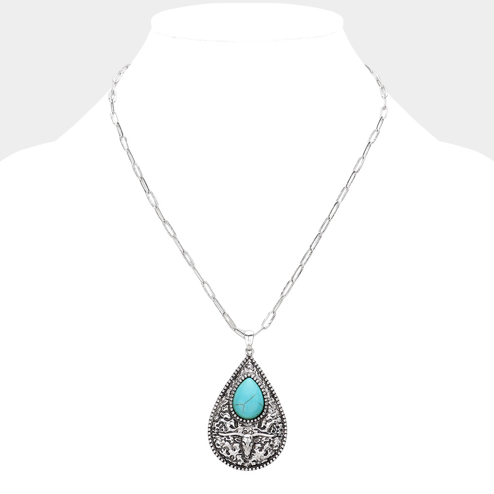 Details • Necklace Size : 19" + 2.25" L • Pendant Size : 1.3" X 2.25" • Vintage-inspired silver-tone necklace with a teardrop-shaped pendant featuring intricate filigree detailing and a striking turquoise stone centerpiece. A timeless piece that adds a touch of bohemian elegance to any outfit. • Lead and Nickel Compliant