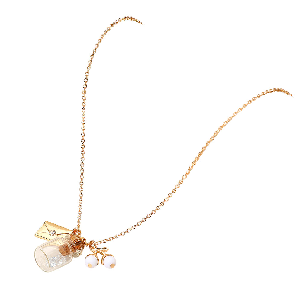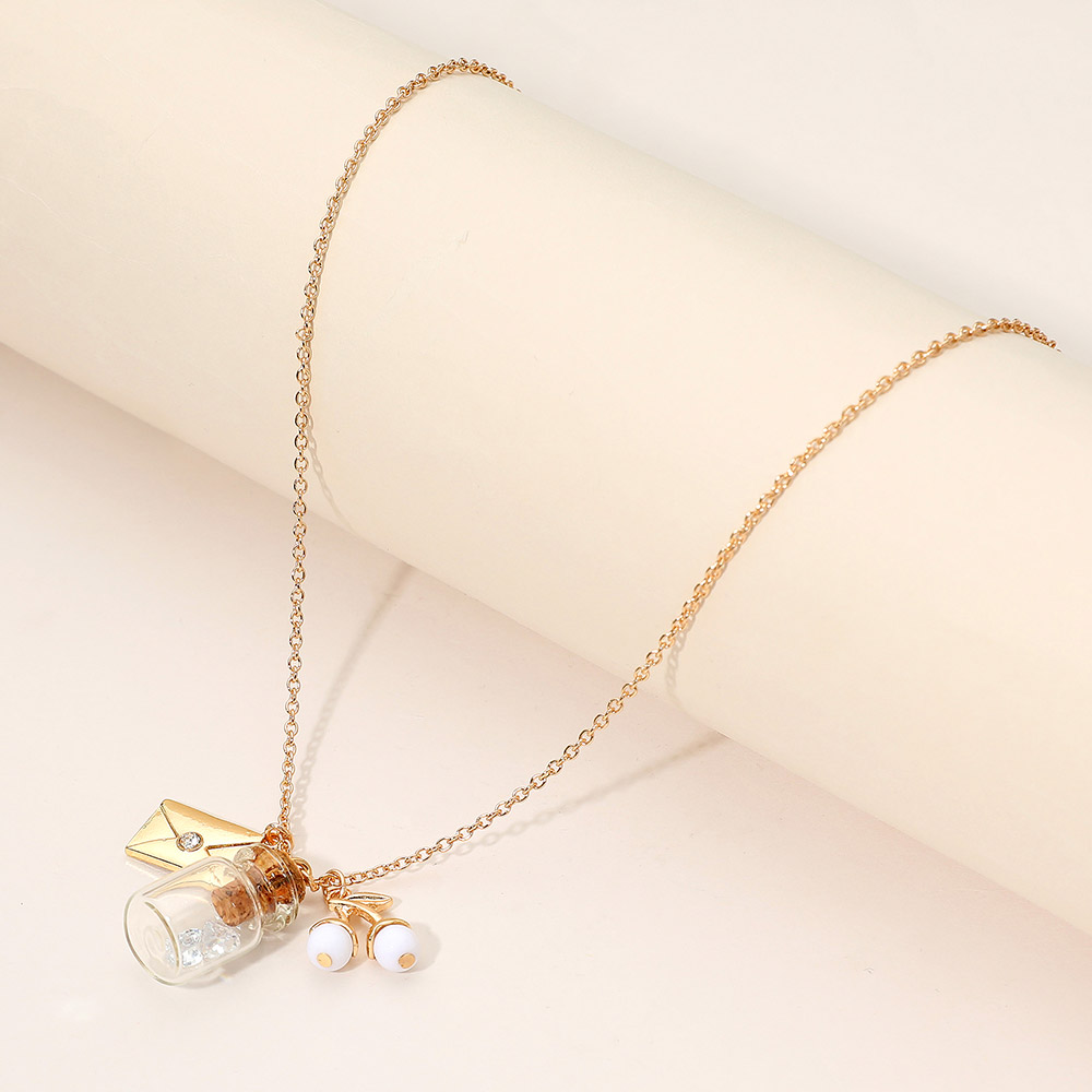 • Whimsical charm necklace featuring a mini glass bottle, cherry pendant, and tiny envelope charm for a playful yet elegant look. Perfect for adding a cute and creative touch to everyday outfits, blending charm and sophistication in one delightful and eye-catching accessory.