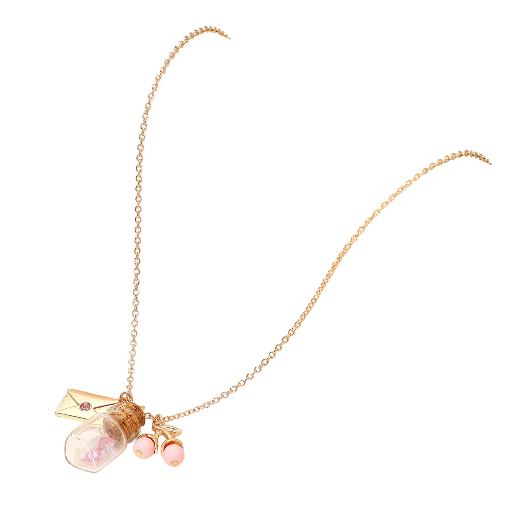 • Whimsical charm necklace featuring a mini glass bottle, cherry pendant, and tiny envelope charm for a playful yet elegant look. Perfect for adding a cute and creative touch to everyday outfits, blending charm and sophistication in one delightful and eye-catching accessory.