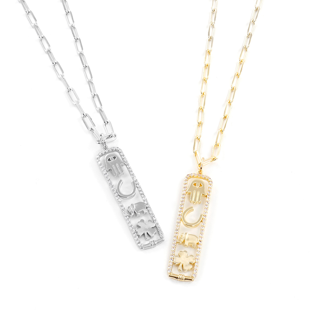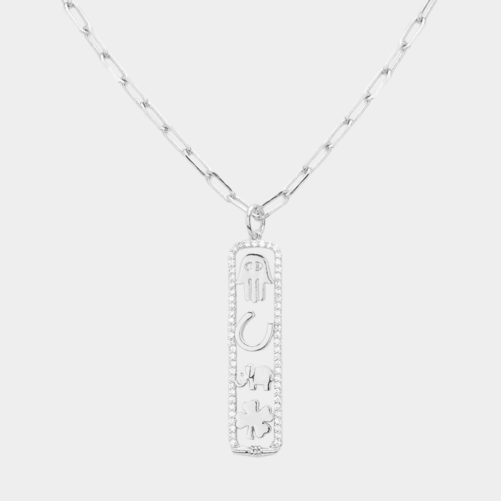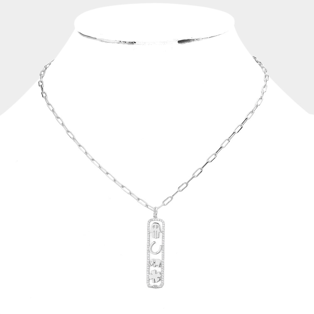 White Gold Dipped Brass Metal CZ Embellished Hamsa Hand Horseshoe Elephant Clover Pendant Necklace